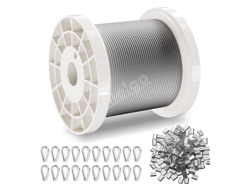 Nerezové lanko 1/16" 7×7 330 ft, 80 objímok, 20 očiek, 450 lbs