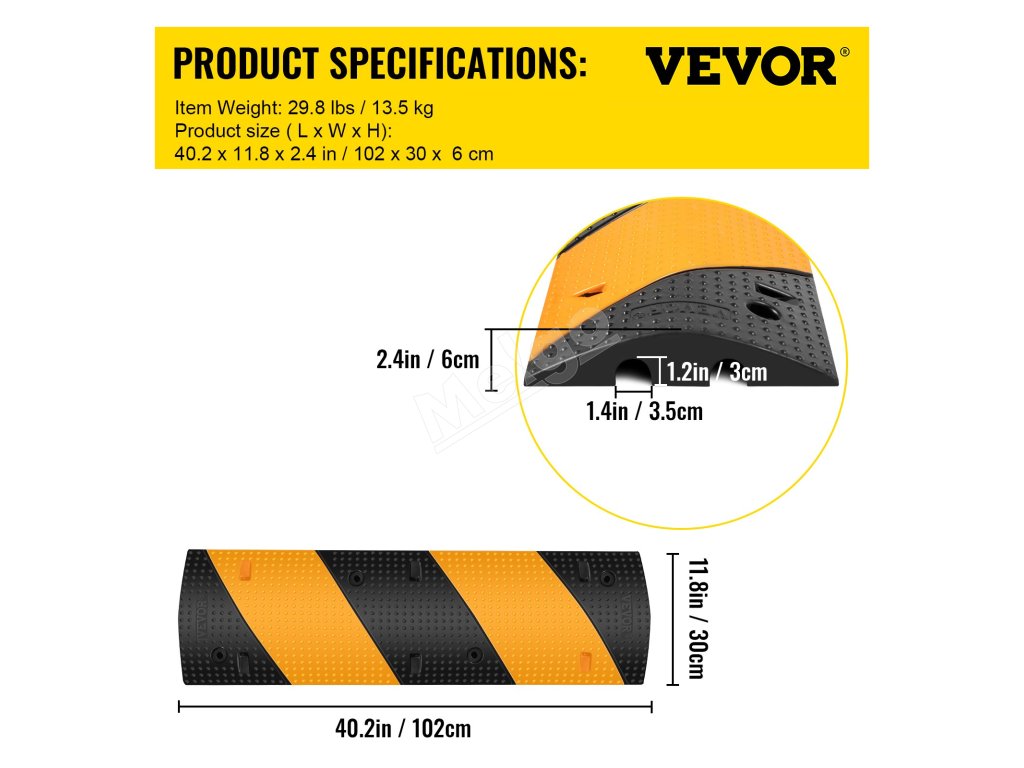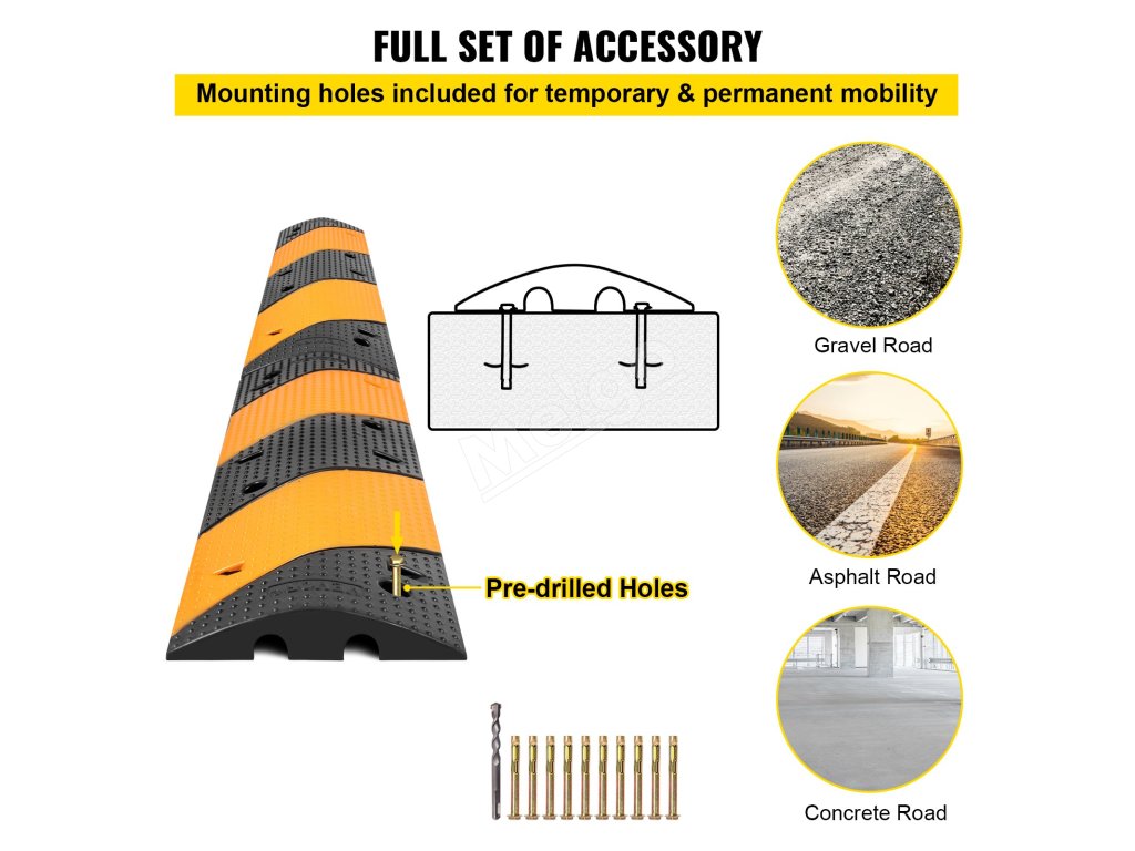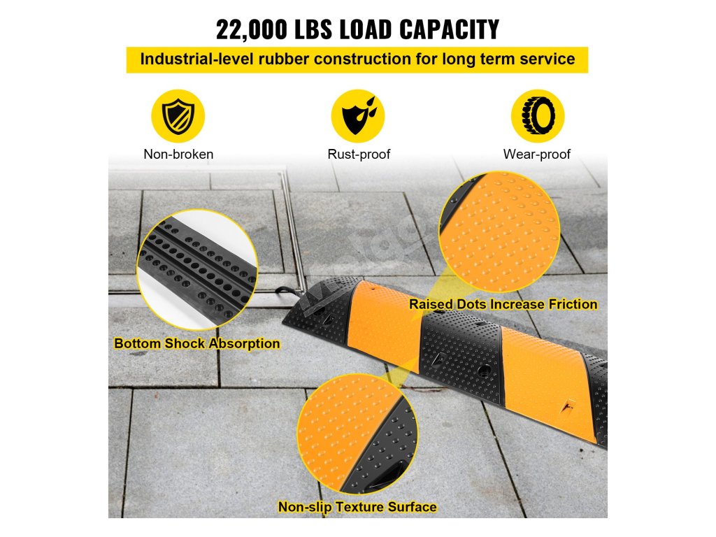 Tento rýchlostný nájazd je navrhnutý tak, aby kontroloval rýchlosť premávky a poskytoval dostatok priestoru pre cestné káble a zároveň nepoškodzoval auto ani cestu. Využíva vysokokvalitnú gumovú konštrukciu s reflexnými žltými časťami, nosnosť 22 000 libier a bezpečnosť pri používaní v noci.
