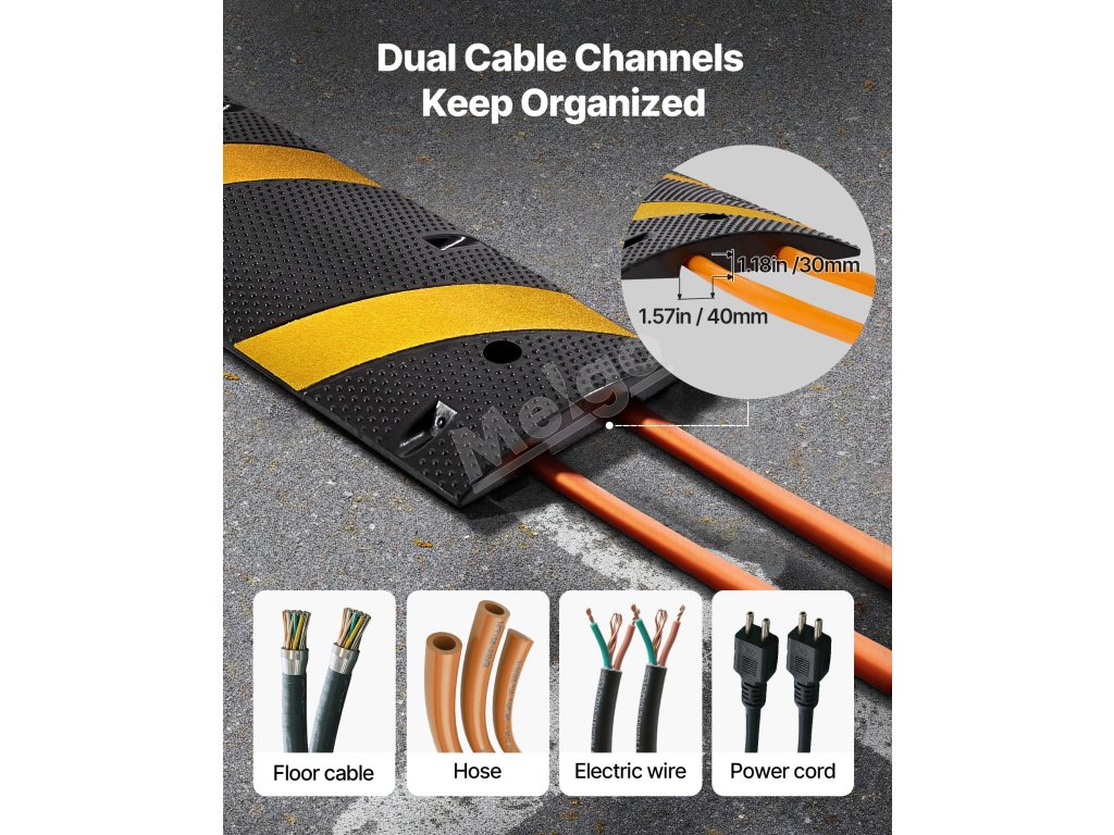 Táto ochranná rampa na káble je vyrobená z pevnej gumy odolnej proti opotrebovaniu a vydrží až 22 000 lbs/os, takže udrží vaše káble v bezpečí aj počas dopravnej špičky. Dvojkanálová konštrukcia umožňuje viesť dva samostatné káble bez toho, aby sa zamotali, zatiaľ čo priložené koncové kryty zabraňujú nebezpečenstvu zakopnutia chodcov.