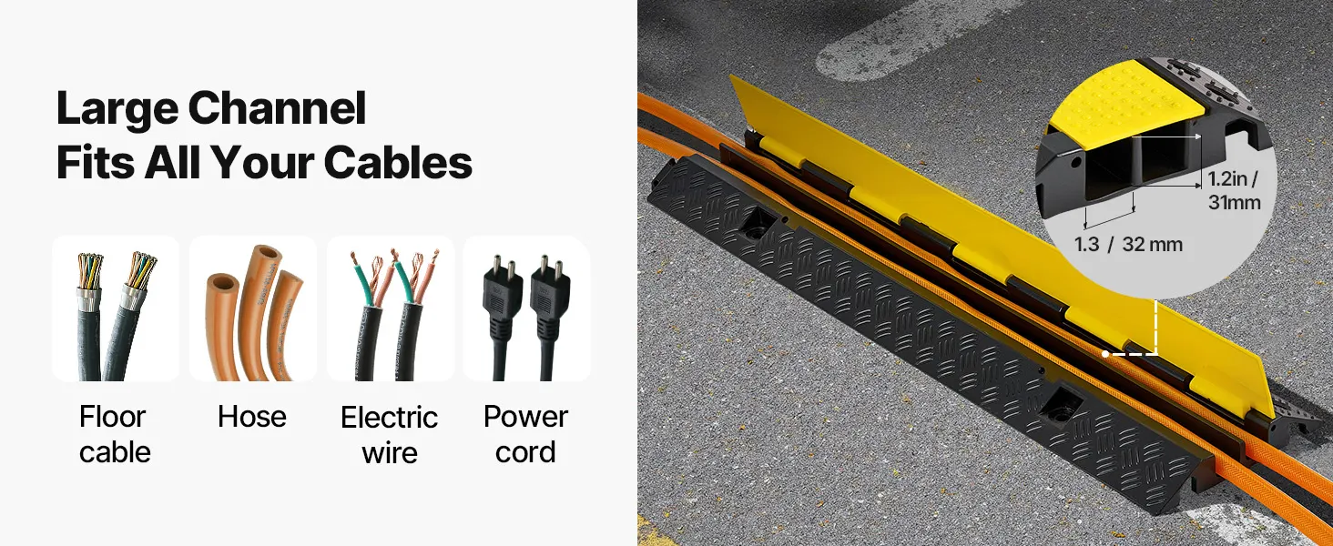 Náš podlahový kryt káblov poskytuje dostatok priestoru na ochranu napájacích káblov, dátových káblov, hadíc a ďalších.