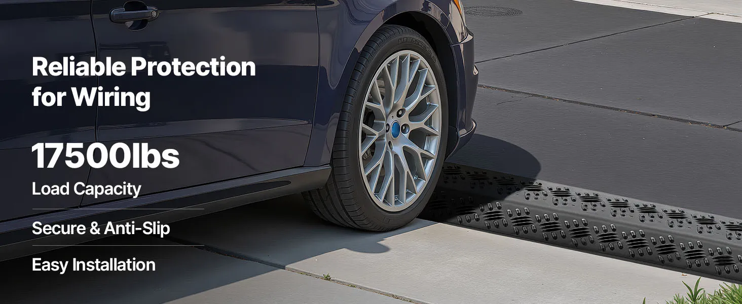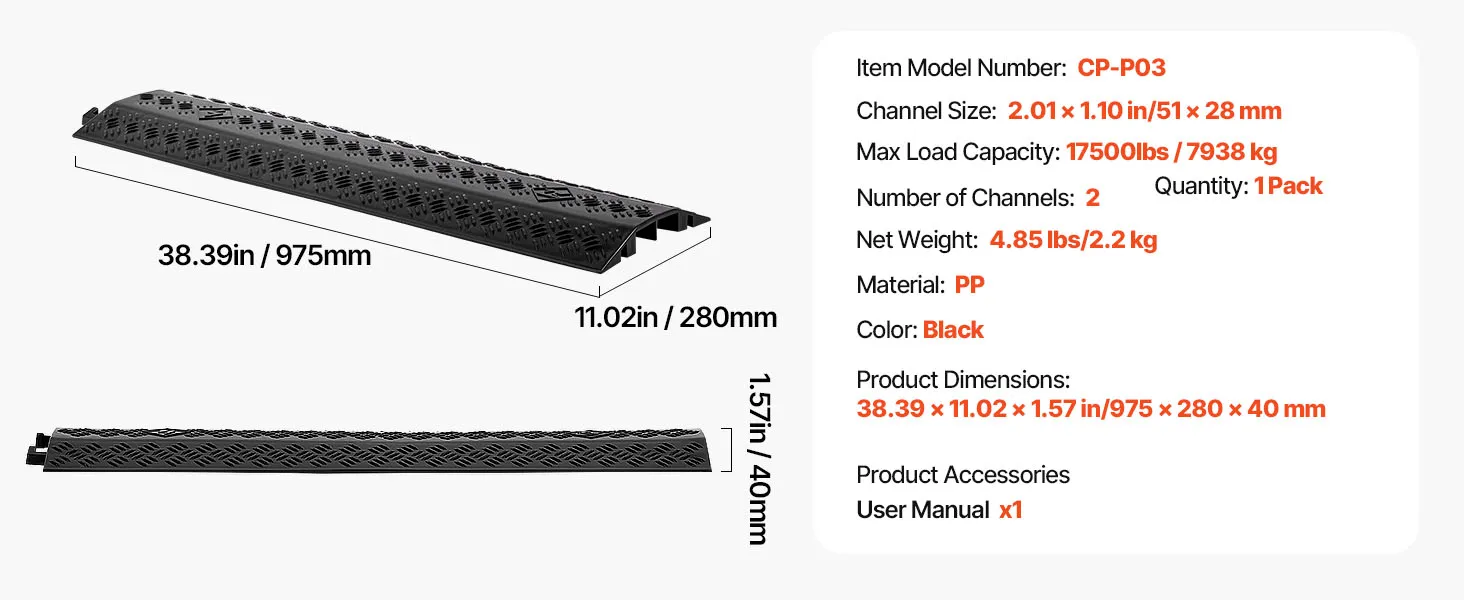 Táto ochranná rampa na káble, vyrobená z ľahkého, ale odolného PP materiálu, sa ľahko prenáša, umiestňuje a inštaluje bez nepríjemných pachov. Udrží až 17 500 lbs/os, pričom obstojí aj pri silnej premávke vozidiel. Dvojkanálová konštrukcia umožňuje viesť dva samostatné káble bez toho, aby sa zamotali.