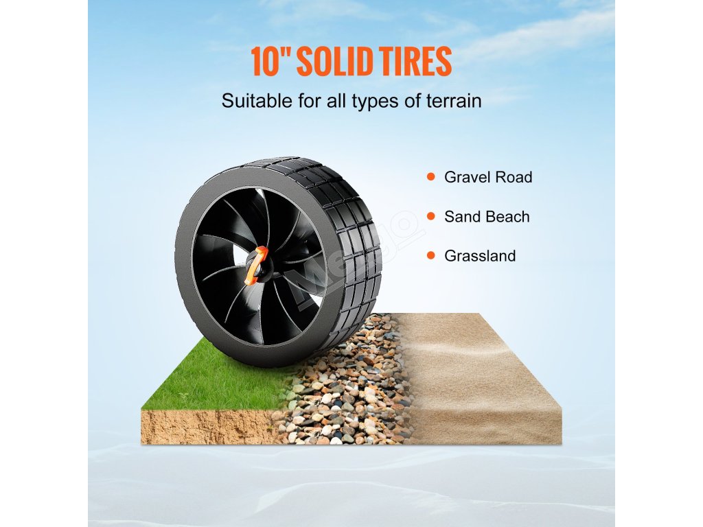 Kajakársky vozík VEVOR je vybavený veľkými 10'' plnými pneumatikami. Tieto pneumatiky uľahčujú pohyb kajakov po rôznych terénoch. Či už ide o piesok, štrk alebo betón, pneumatiky zvládnu všetko. Pevný PU materiál zaručuje, že sa pneumatika nerozbije. To znamená menej starostí a viac pohodlia. Veľký rozmer pneumatík navyše pomáha pri tlmení nárazov. Znižuje tak zaťaženie kajaku a uľahčuje tlačenie alebo ťahanie. Poskytujú skvelú trakciu, takže váš kajak zostane bezpečný a stabilný. Môžete sa spoľahnúť na kajakársky vozík VEVOR, vďaka ktorému bude preprava vašej lode jednoduchá.