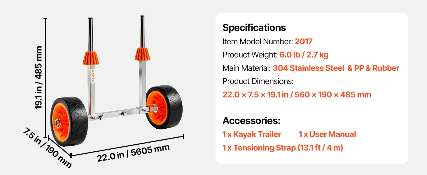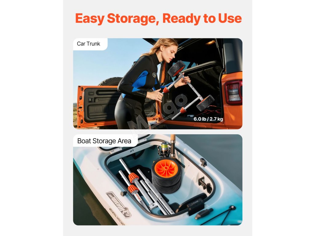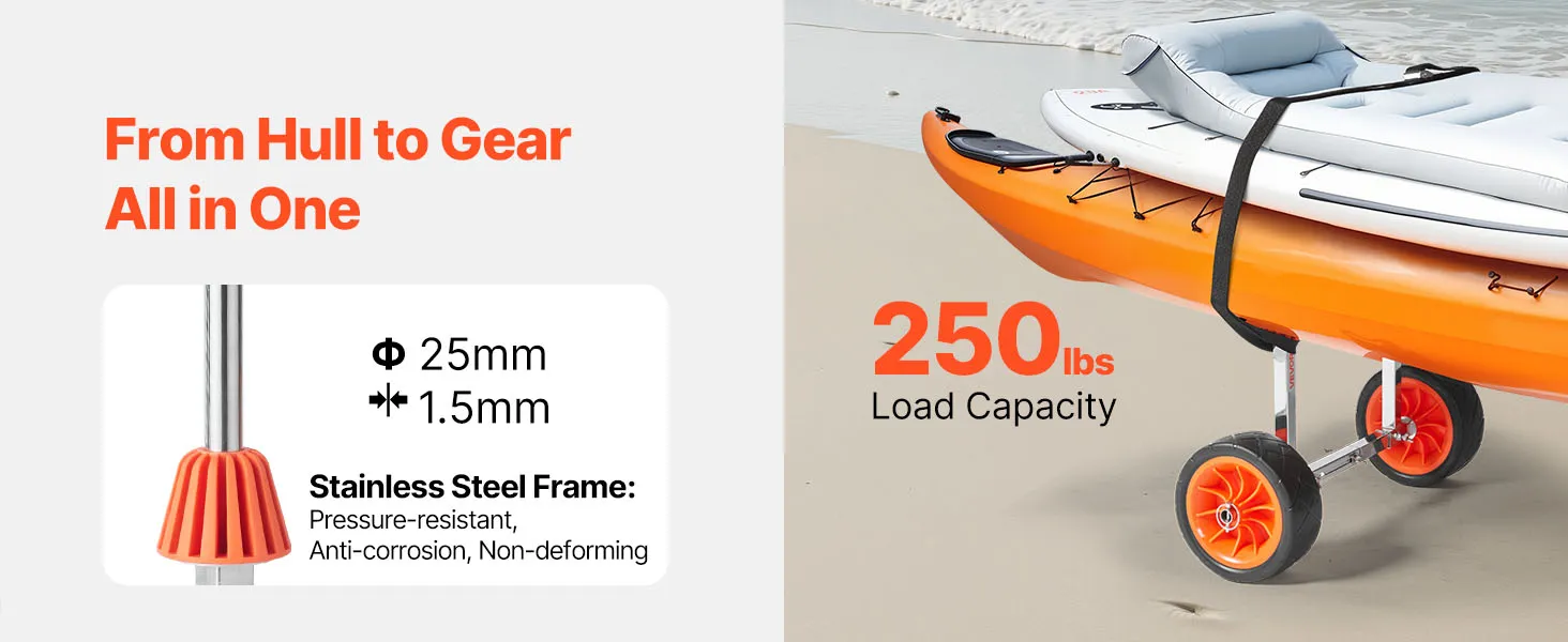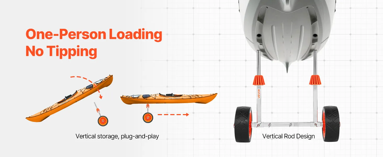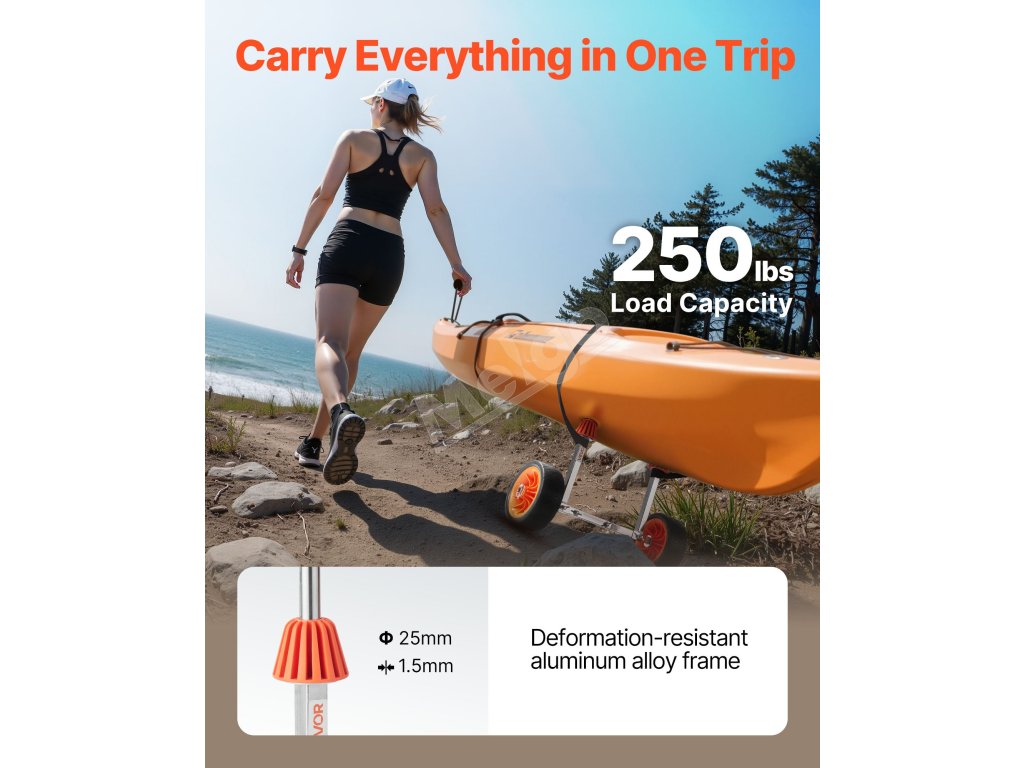 Tento kajakársky vozík s nosnosťou 250 kg je vhodný na prepravu malých lodí alebo kajakov s výbavou. Je ľahko prenosný, bezpečný a ideálny na príležitostné výlety do prírody a ľahkú prepravu.