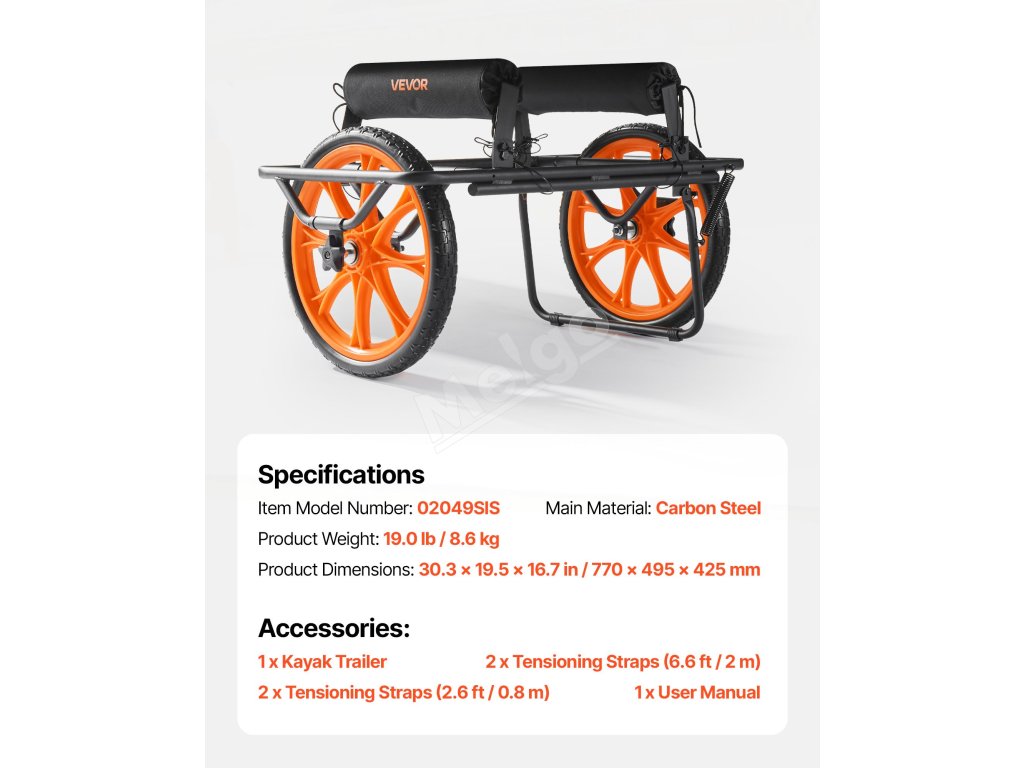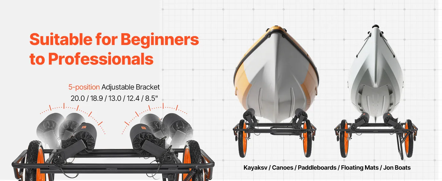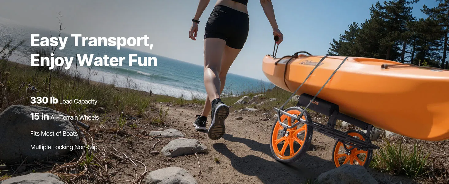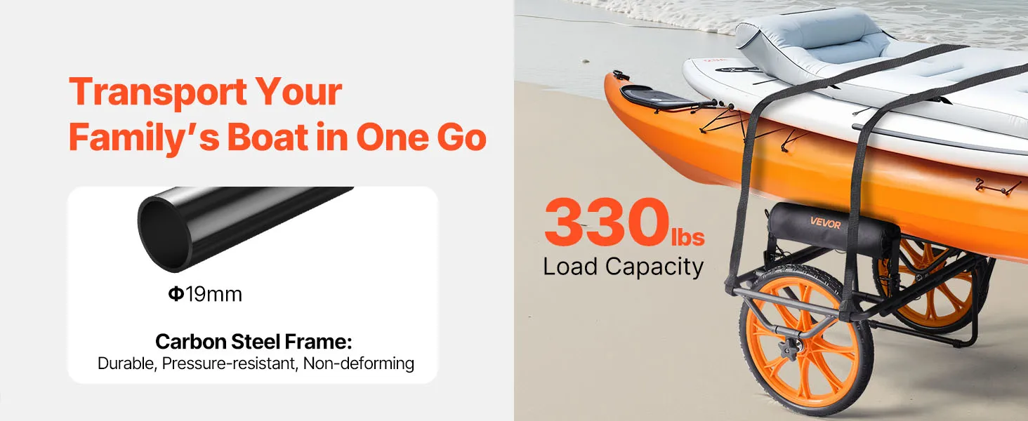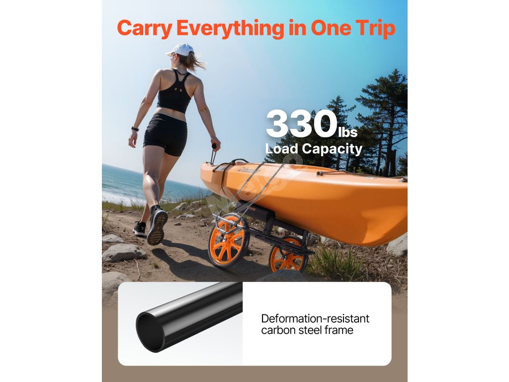 Tento kajakársky vozík s nosnosťou 330 kg je vhodný na prepravu malých lodí alebo kajakov s výbavou. Je ľahko prenosný, bezpečný a ideálny na príležitostné výlety do prírody a ľahkú prepravu.