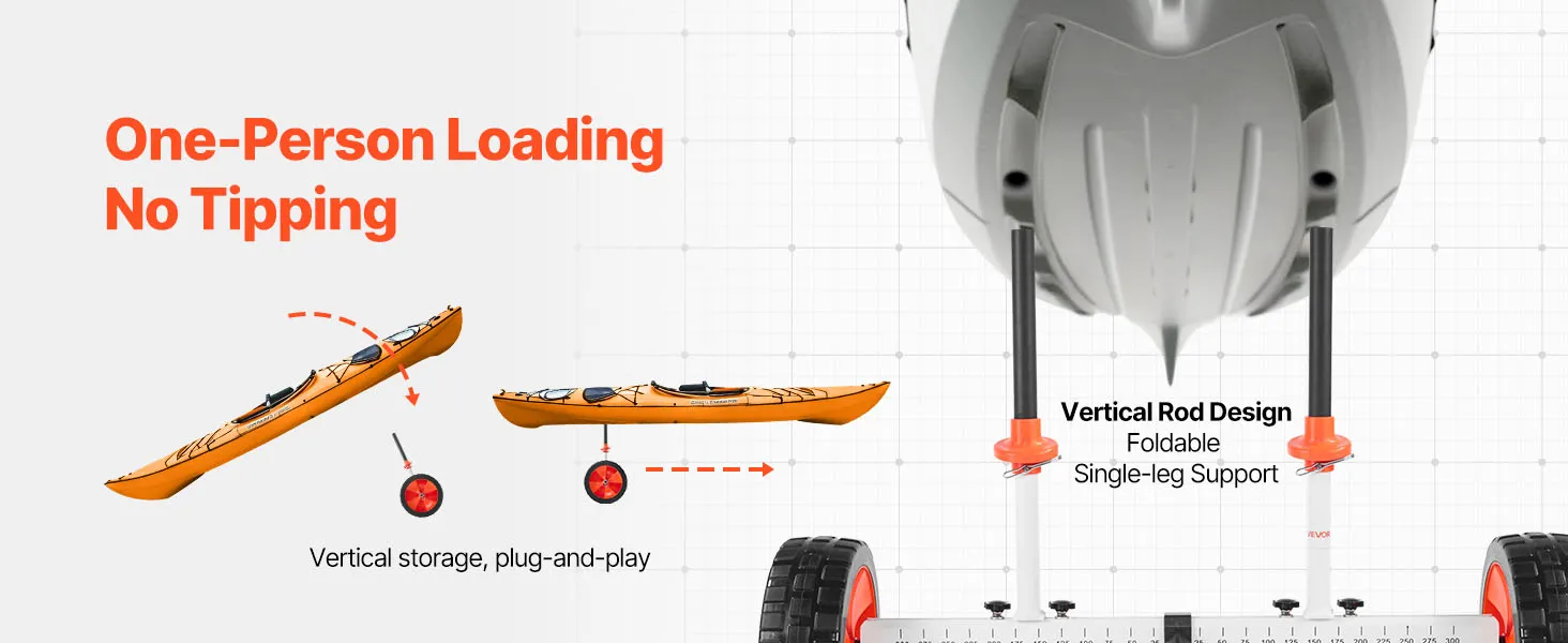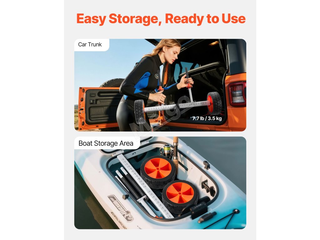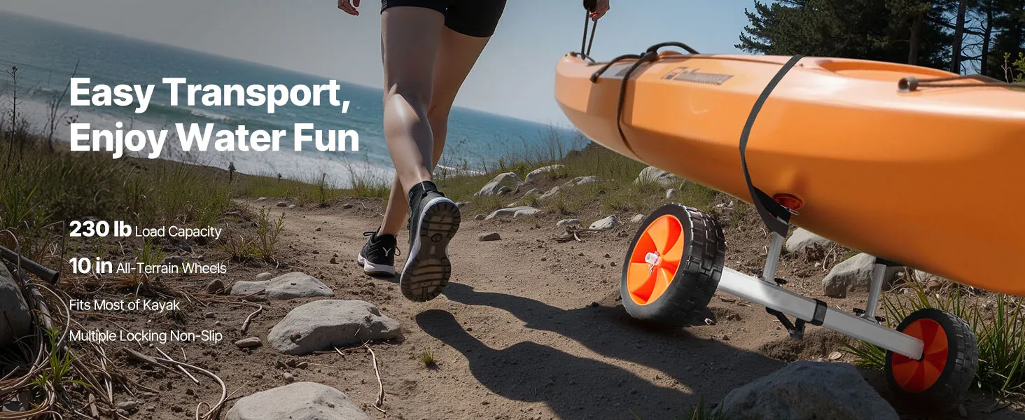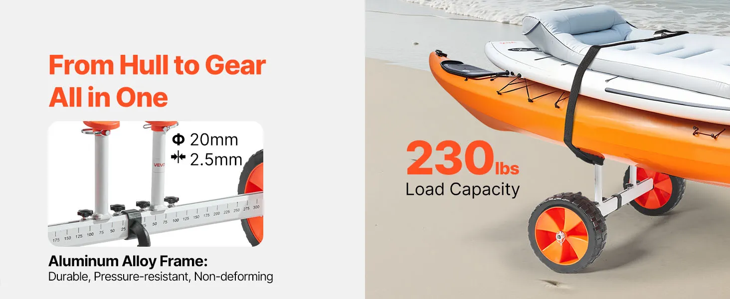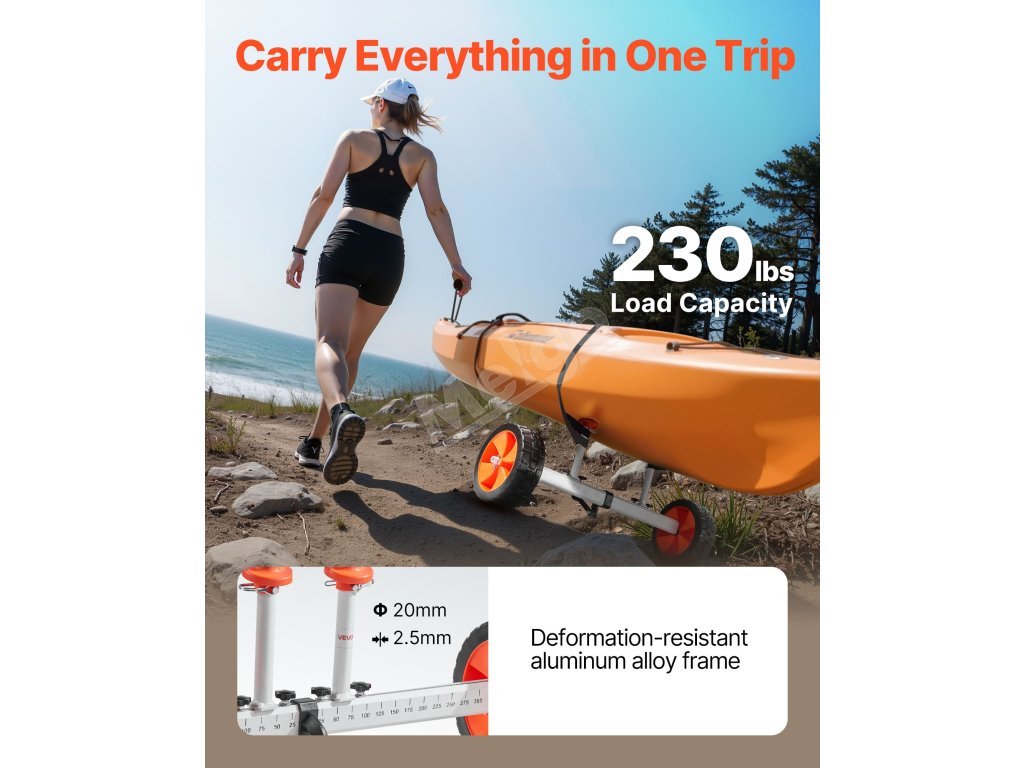 Tento kajakársky vozík s nosnosťou 230 kg je vhodný na prepravu malých lodí alebo kajakov s výbavou. Je ľahko prenosný, bezpečný a ideálny na príležitostné výlety do prírody a ľahkú prepravu.
