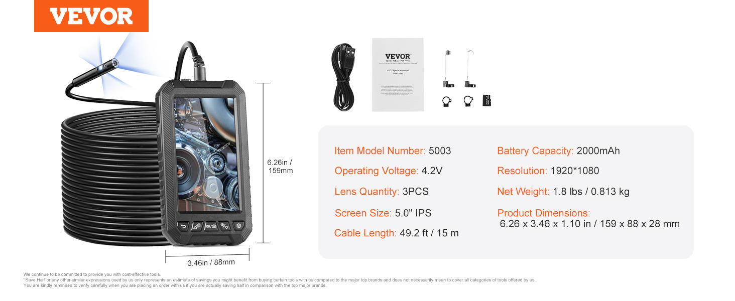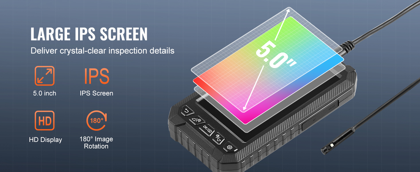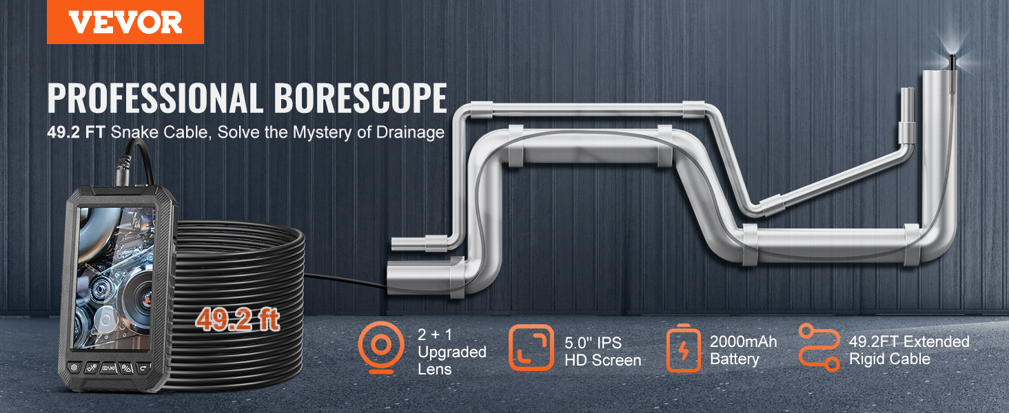 Endoskop VEVOR bol vylepšený o 3 objektívy, ktoré vám pomôžu získať rôzne pohľady. Na 5" obrazovke IPS sa jasne zobrazujú obrázky a videá v reálnom čase a 49,2FT predĺžený polotuhý kábel vám umožní bez námahy dosiahnuť do náročných oblastí, čo je ideálne na kontrolu motora automobilu, kanalizácie, vzduchotechnických potrubí a podobne.