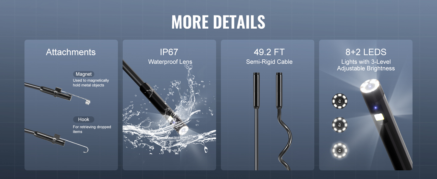 Náš 49,2FT predĺžený polotuhý kábel a 8 mm tenký vodotesný objektív s krytím IP67 vám umožnia ľahký prístup do ťažko prístupných a stiesnených priestorov. V spojení s príslušenstvom, ako je háčik, magnet a ochranný kryt, vám pomôže ľahko získať stratené predmety.