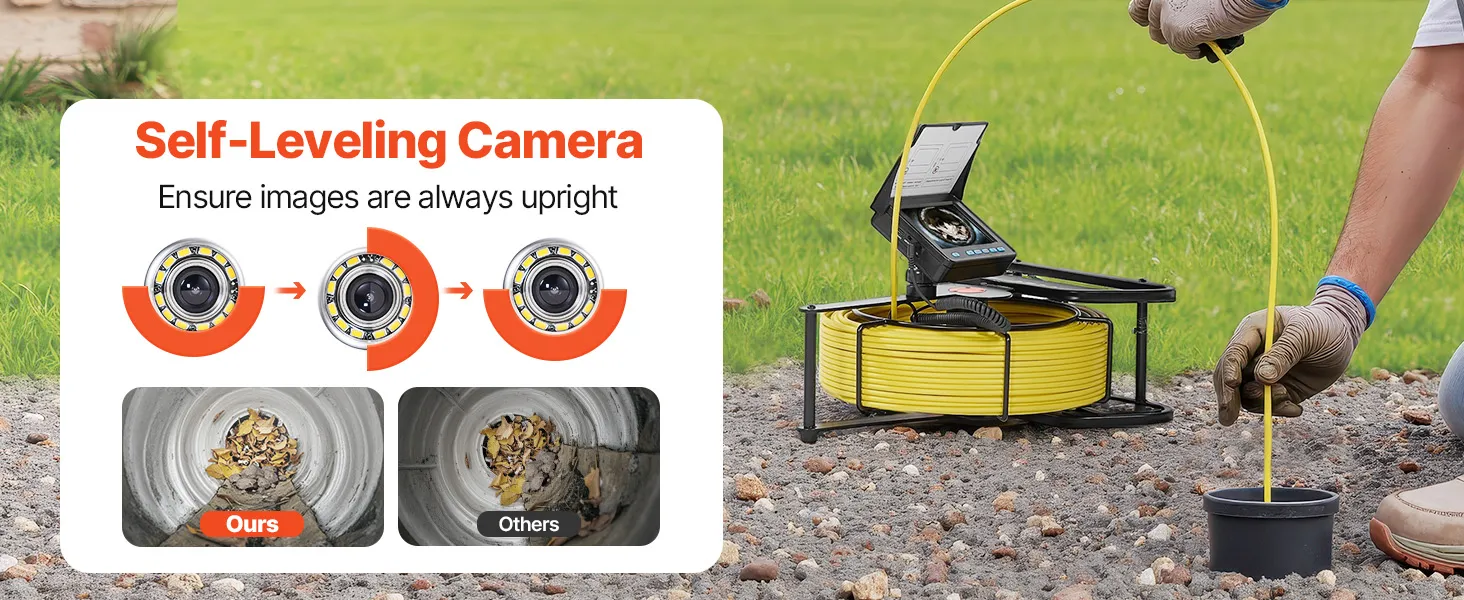 Kanalizačná kamera VEVOR 164FT/50m so samonivelačnou funkciou urýchľuje a zjednodušuje kontrolu potrubia! Je vybavená 4,3-palcovou obrazovkou s rozlíšením HD, označením dĺžky kábla, 12 ks nastaviteľných LED diód, batériou 4500 mAh a predstavuje profesionálne riešenie na kontrolu bazénového potrubia, kanalizačných systémov, HVAC a ďalších.