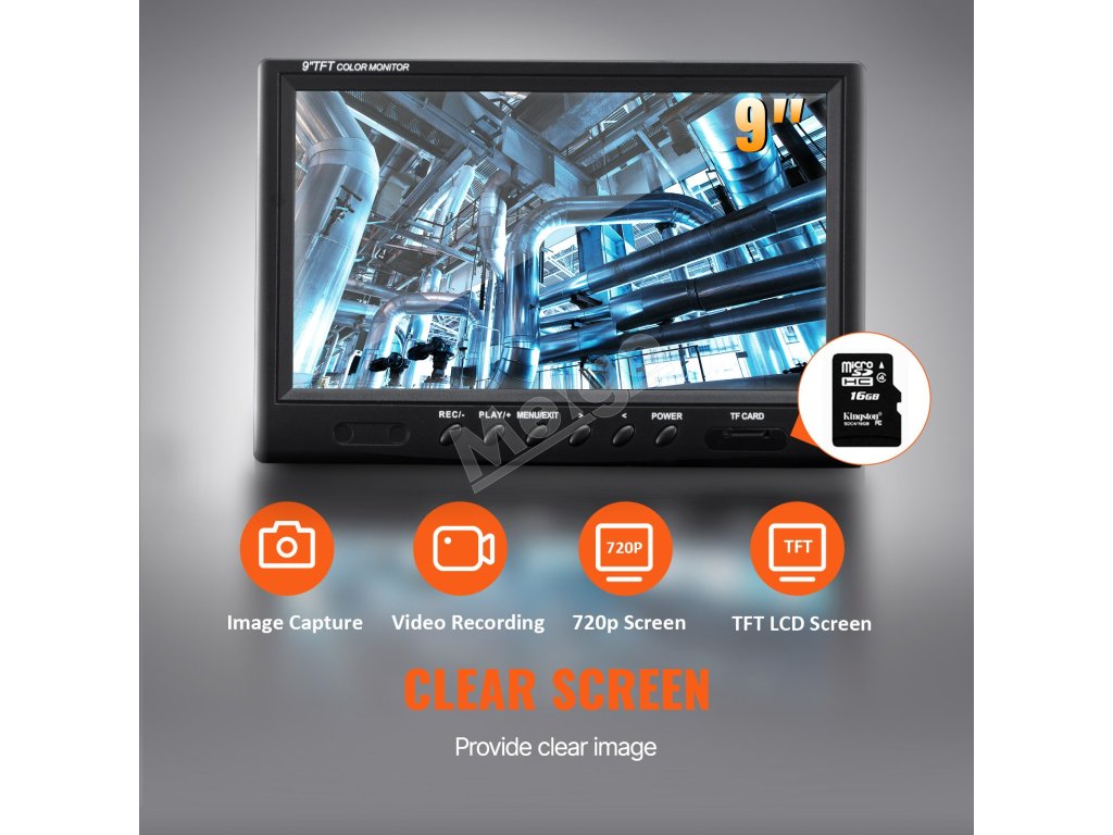Modernizovaný monitor DVR tejto kanalizačnej kamery je vybavený 9-palcovou obrazovkou s rozlíšením 720P, ktorá poskytuje jasný obraz. Pri práci na projekte môžete nahrávať videá alebo snímať fotografie, ktoré možno uložiť na 16 GB kartu SD.