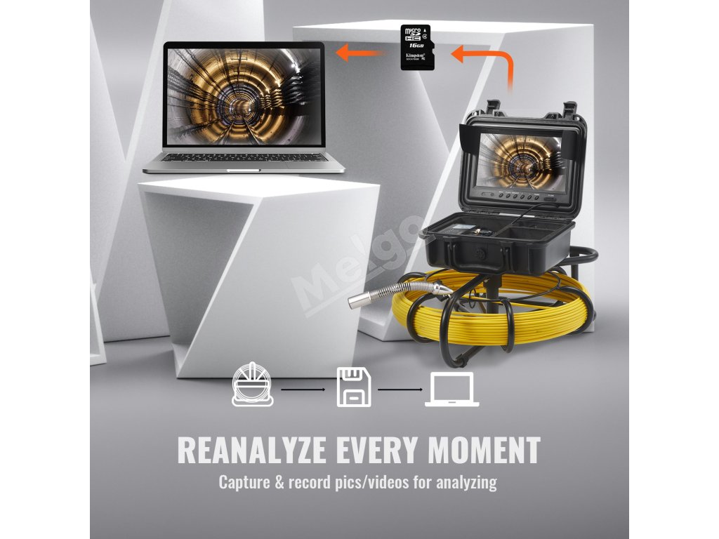 Modernizovaný monitor DVR tejto kanalizačnej kamery je vybavený 9-palcovou obrazovkou s rozlíšením 720P, ktorá poskytuje jasný obraz. Pri práci na projekte môžete nahrávať videá alebo snímať fotografie, ktoré možno uložiť na 16 GB kartu SD.