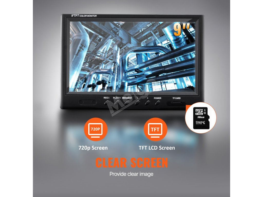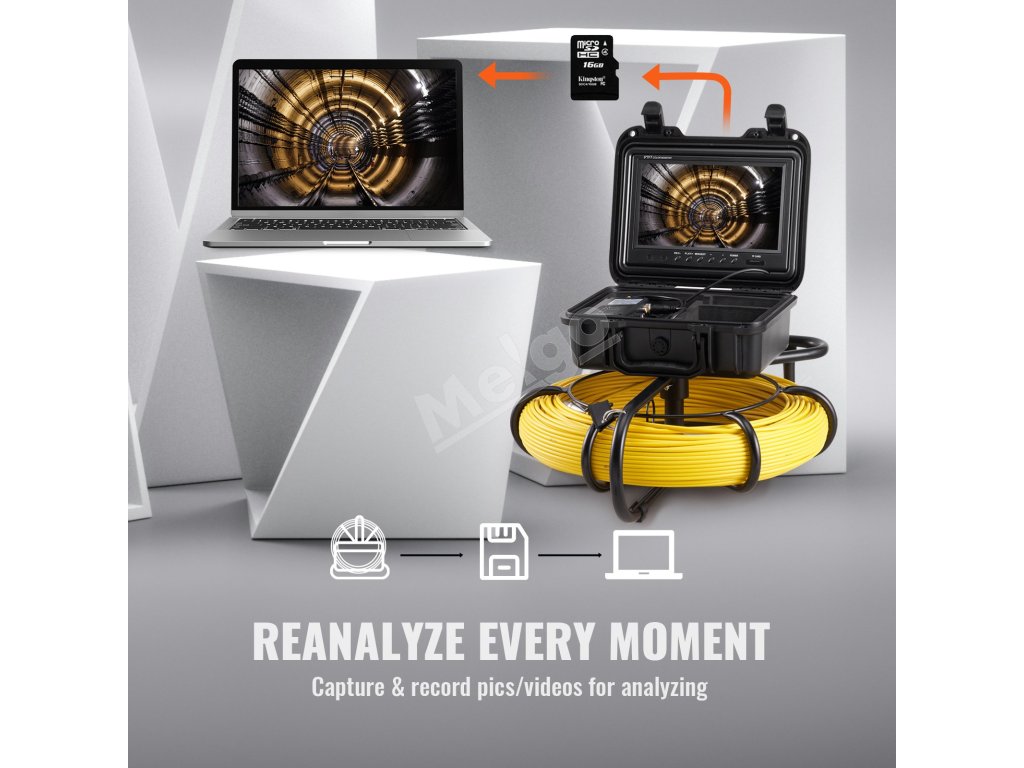 Modernizovaný monitor DVR tejto kanalizačnej kamery je vybavený 9-palcovou obrazovkou s rozlíšením 720P, ktorá poskytuje jasný obraz. Pri práci na projekte môžete nahrávať videá alebo snímať fotografie, ktoré možno uložiť na 16 GB kartu SD.