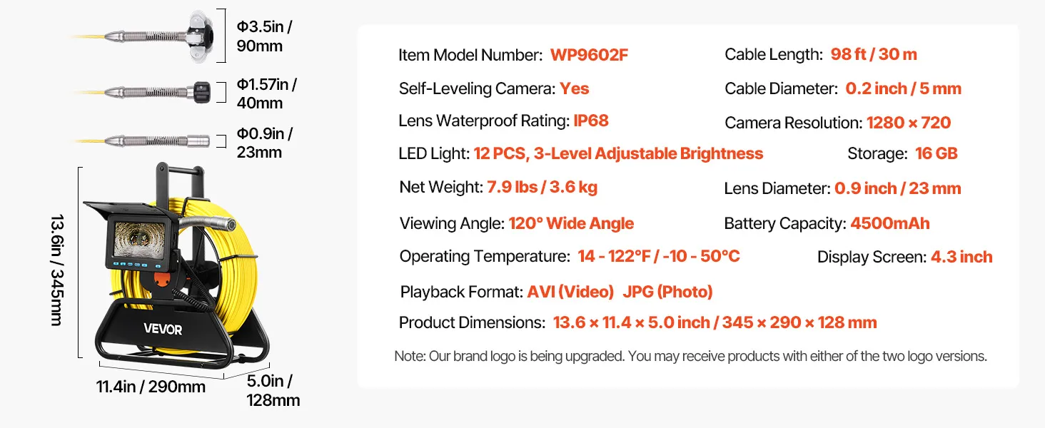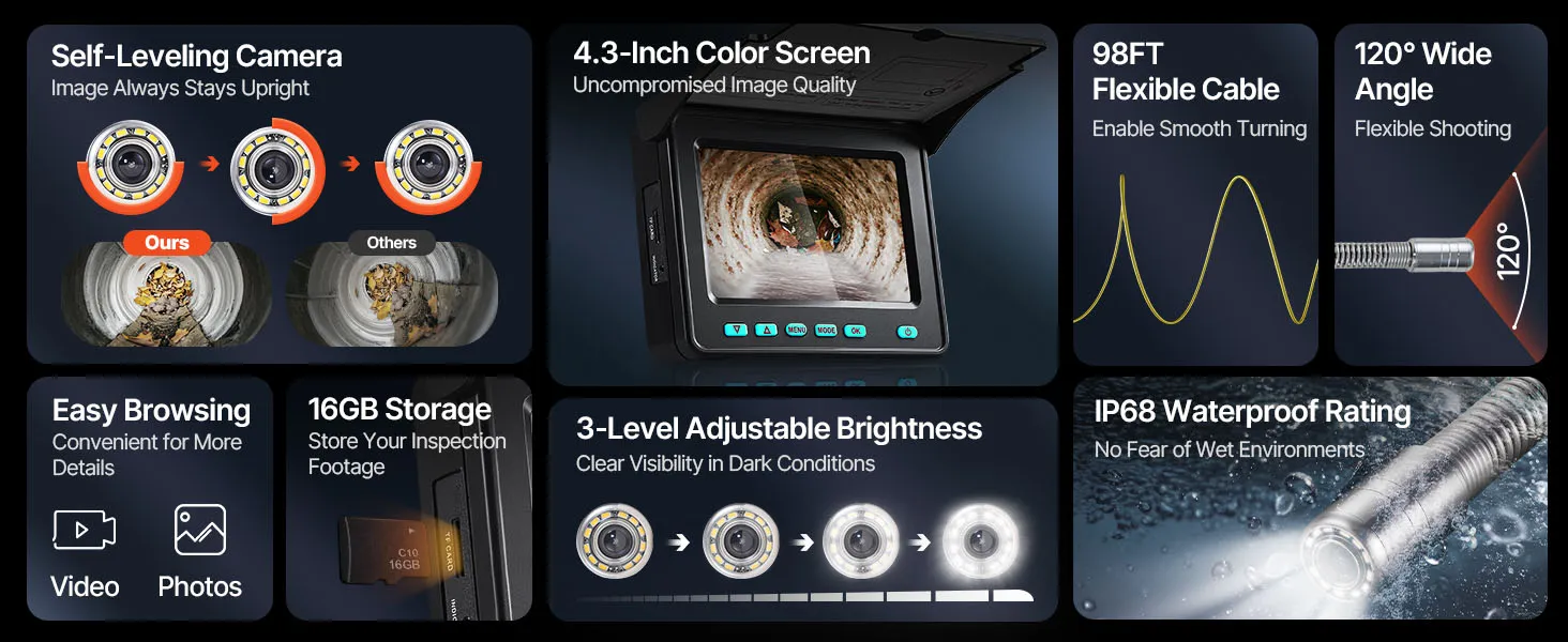 Kanalizačná kamera VEVOR 98FT/30m so samonivelačnou funkciou urýchľuje a zjednodušuje kontrolu potrubia! Je vybavená 4,3-palcovou obrazovkou s rozlíšením HD, označením dĺžky kábla, 12 ks nastaviteľných LED diód, batériou 4500 mAh a predstavuje profesionálne riešenie na kontrolu bazénového potrubia, kanalizačných systémov, HVAC a ďalších.
