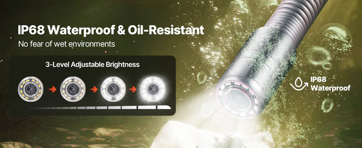 Táto vodotesná kamera na kontrolu potrubia s krytím IP68 je vybavená 12 nastaviteľnými LED svetlami s 3-stupňovým nastavením jasu, ktoré vyhovujú rôznym svetelným podmienkam v tmavých kanalizačných potrubiach.