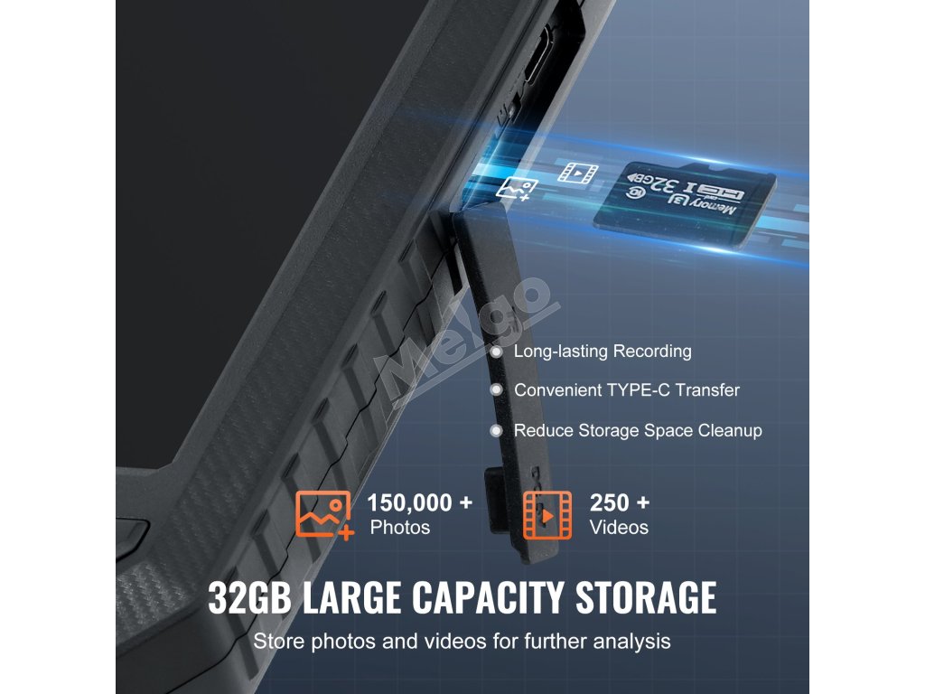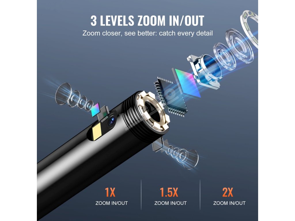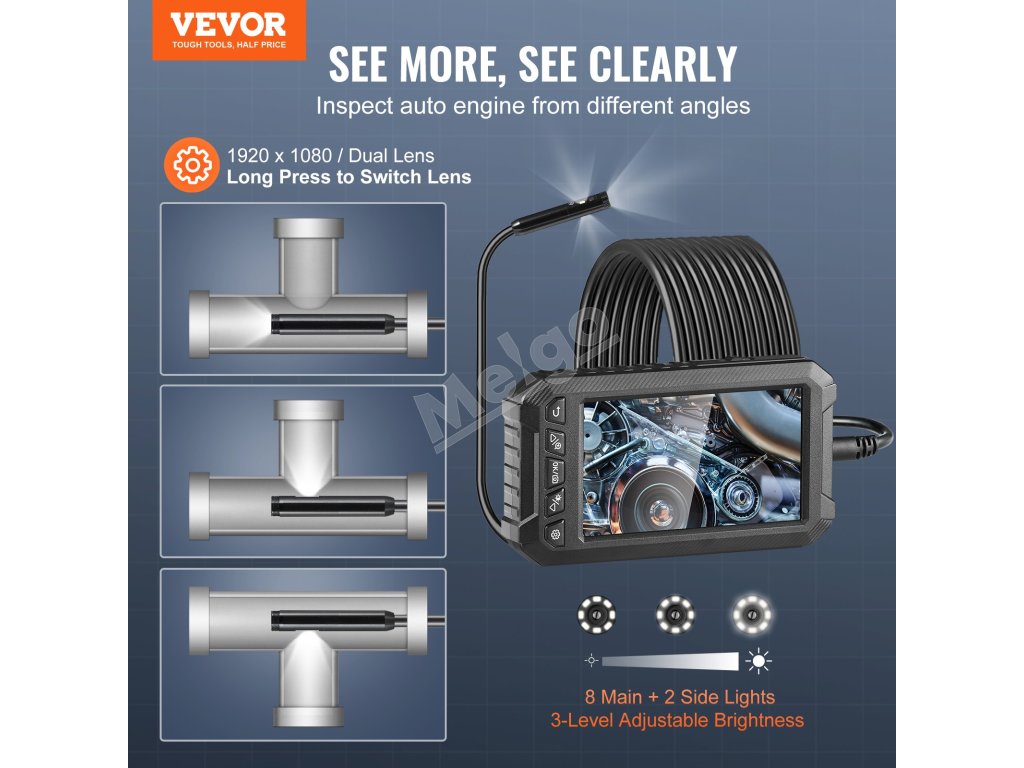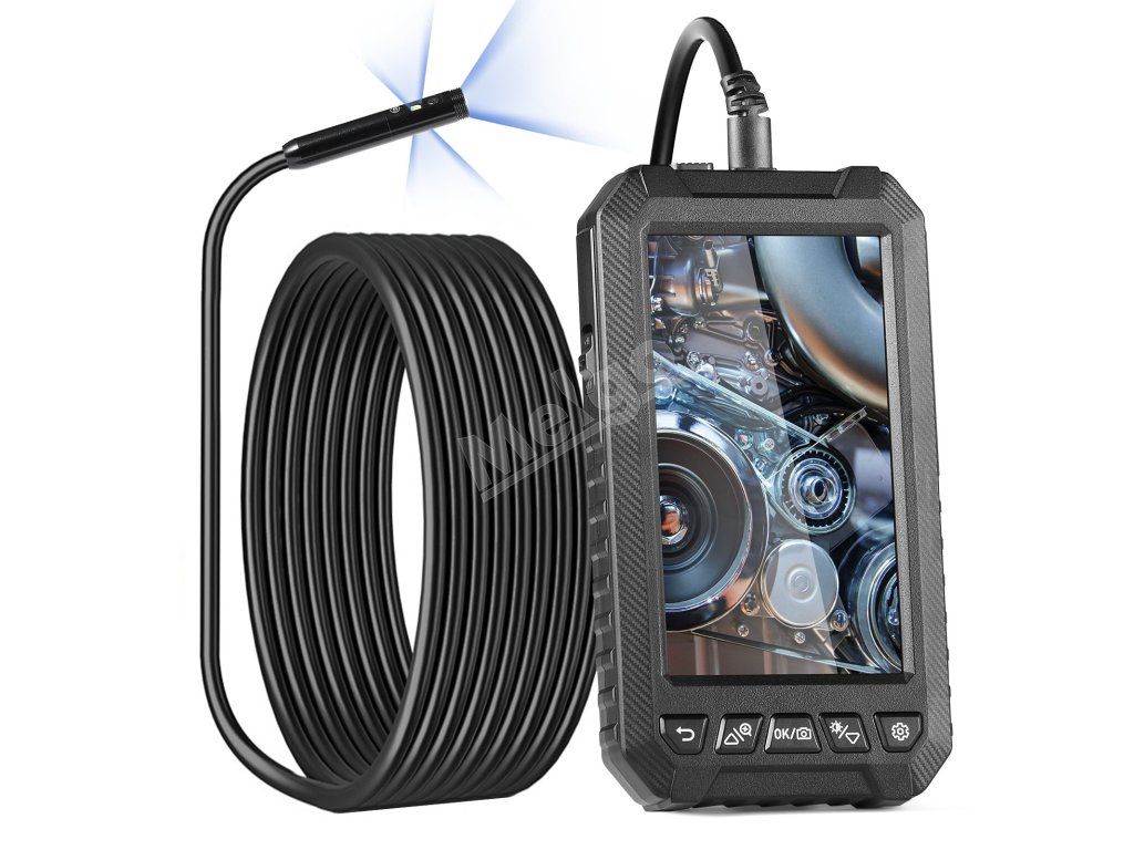 Kamera boresskopu má 8 + 2 svetlá s 3 nastaviteľnými úrovňami jasu, ktoré poskytujú dostatok svetla v tmavých situáciách. Ponúka väčšie zorné pole, kontrolu v reálnom čase v rozlíšení HD a ostrejšie snímky, ktoré sa skvele hodia na kontrolu vnútorných valcov motora a vodovodného potrubia.