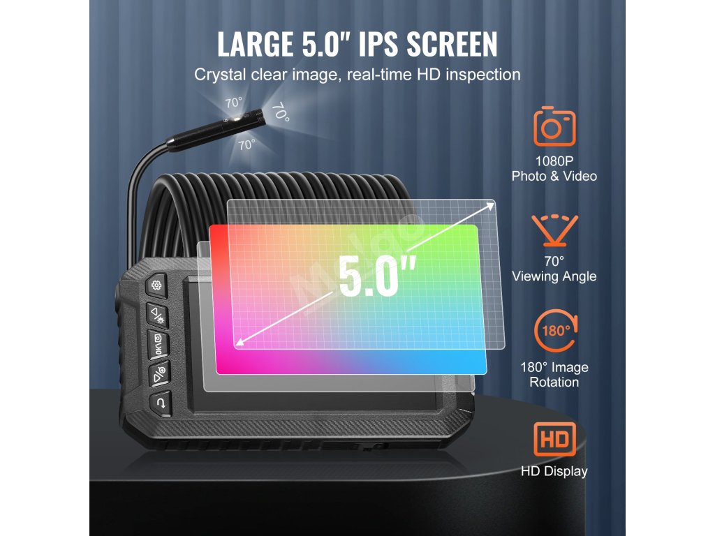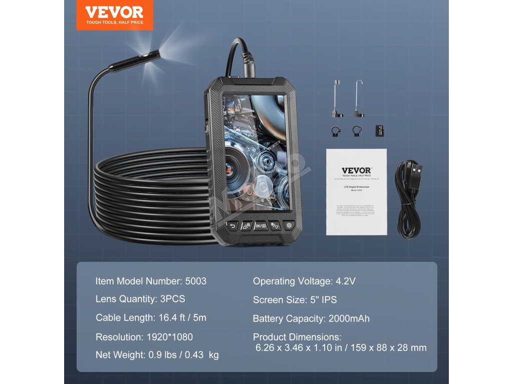 Endoskop VEVOR bol vylepšený o 3 objektívy, ktoré vám pomôžu získať rôzne pohľady. Na 5" obrazovke IPS sa jasne a živo zobrazujú obrázky a videá v reálnom čase. Získajte túto dokonalú kameru boresskopu na kontrolu automobilových motorov, kontrolu kanalizácie, kontrolu vzduchotechnických potrubí a ďalšie.