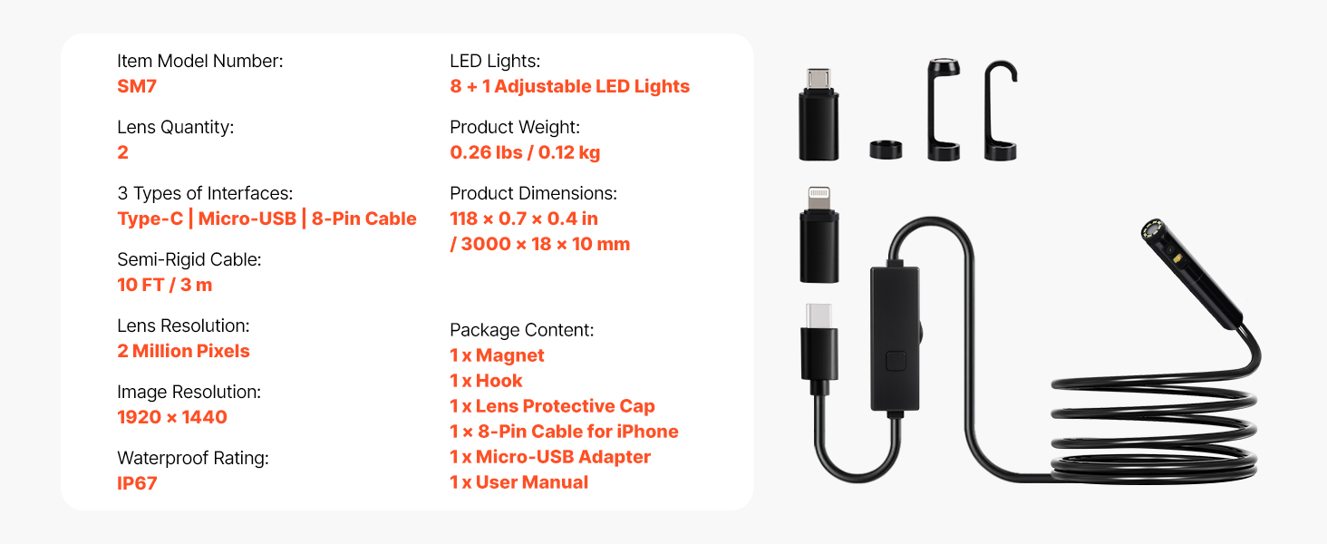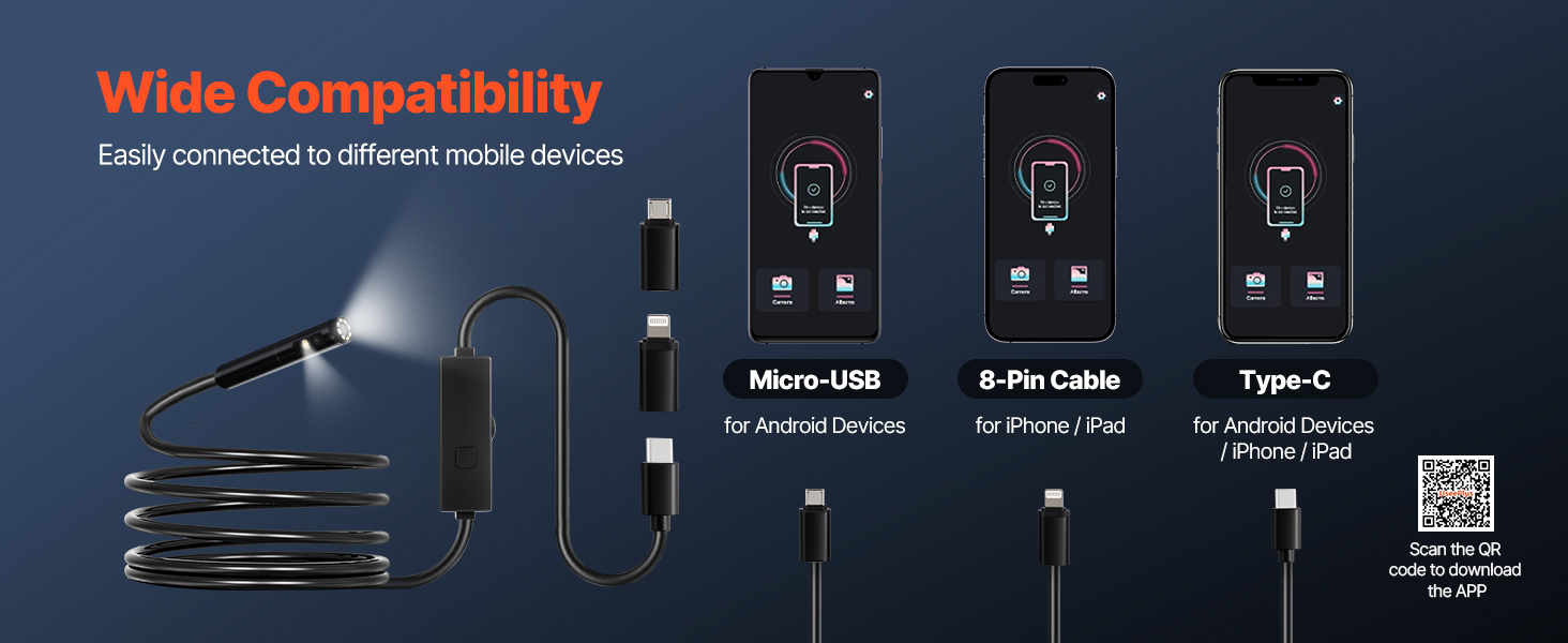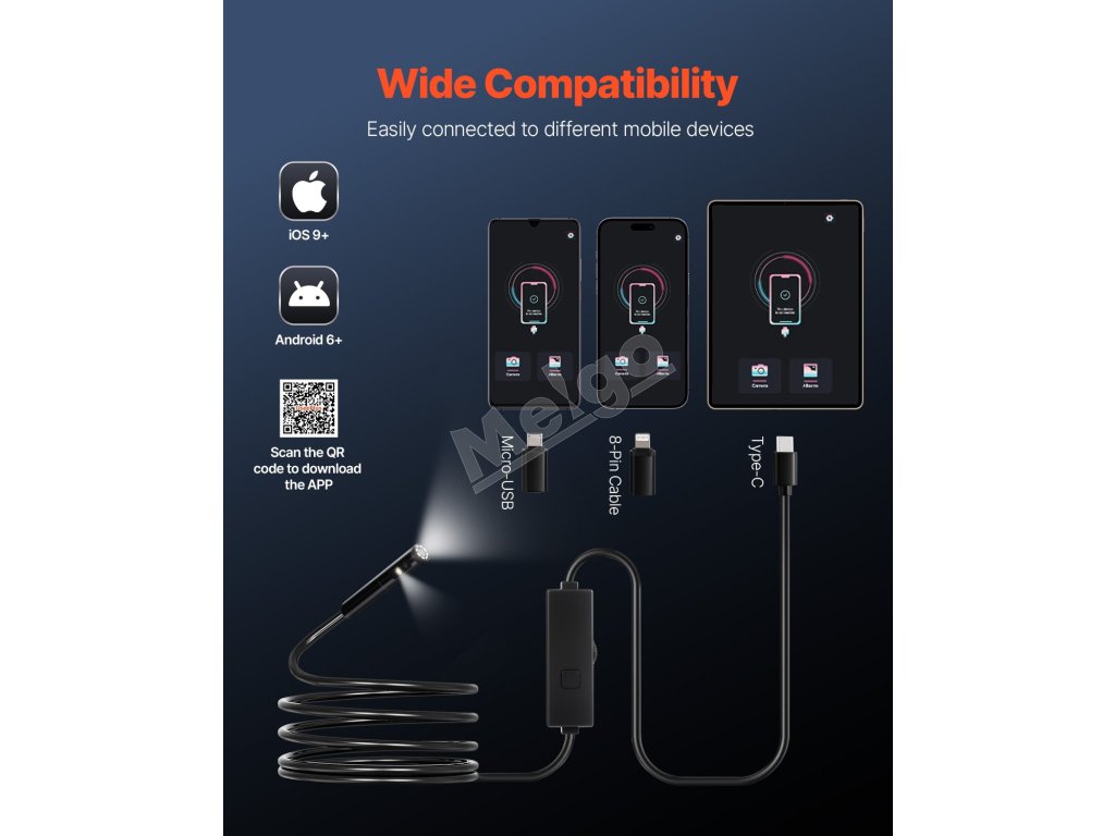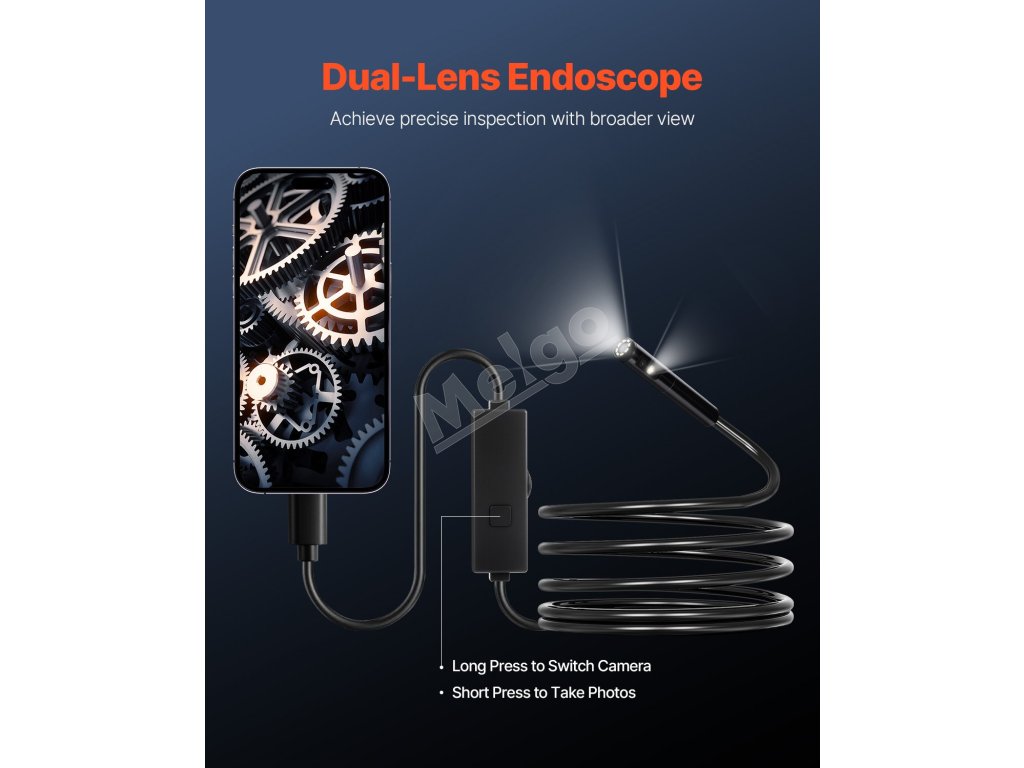 Náš endoskop bol vylepšený o dva objektívy, ktoré vám pomôžu získať rôzne pohľady. Dodáva sa s 8-kolíkovým káblom, adaptérom typu C a adaptérom Micro-USB, kompatibilným so systémami iOS 9+ a Android 6+ s podporou OTG, ideálnym na kontroly automobilových motorov, kontroly kanalizačných potrubí, kontroly potrubí HVAC a ďalšie.
