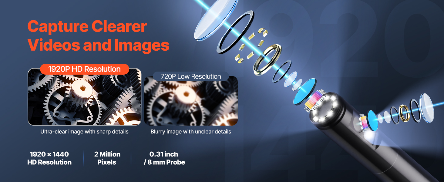 Táto 2,0 MP kamera borescopu poskytuje jasné a živé snímky v HD rozlíšení 1920 x 1440. Okrem toho možno snímky priblížiť 1×, 1,5× alebo 2×, čo umožňuje presné zobrazenie detailov a zvýšenie účinnosti vašich kontrol.
