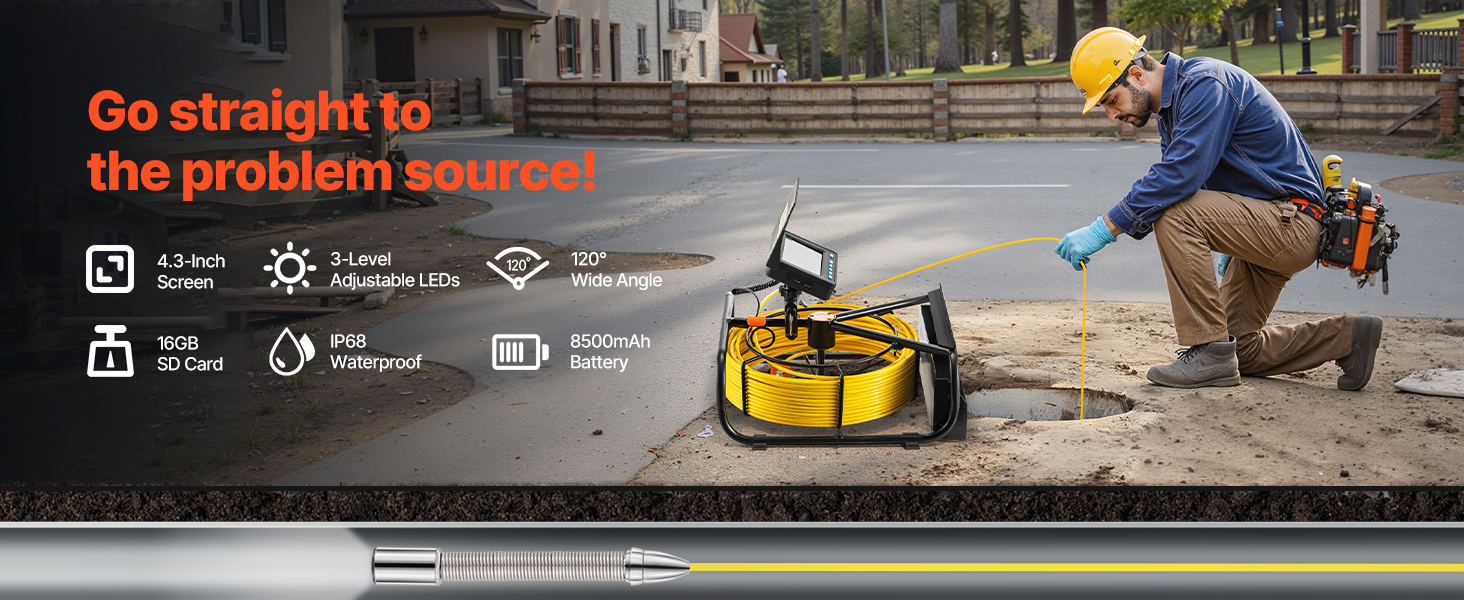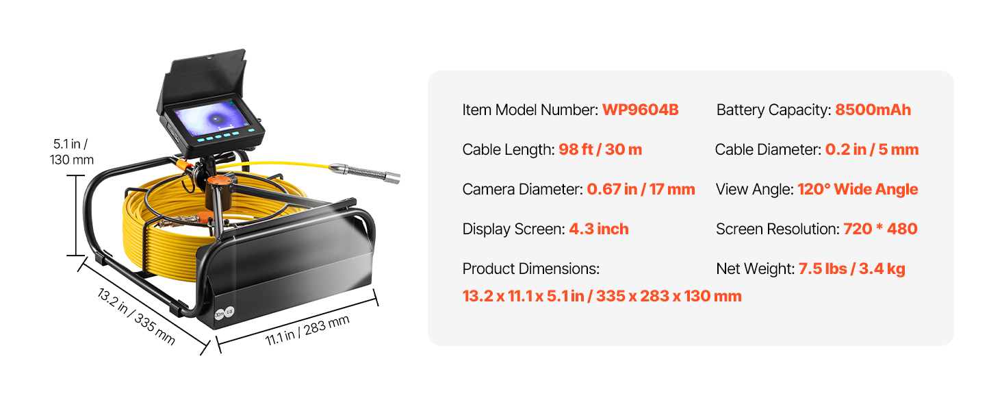 VEVOR 30m kanalizačná kamera urýchľuje a zjednodušuje kontrolu potrubia! Je vybavená 4,3-palcovým farebným LCD displejom, 6PCS nastaviteľnými LED diódami, 8500mAh nabíjateľnou batériou a predstavuje dokonalé profesionálne riešenie na precíznu kontrolu kanalizácie, odpadových potrubí a komínov.