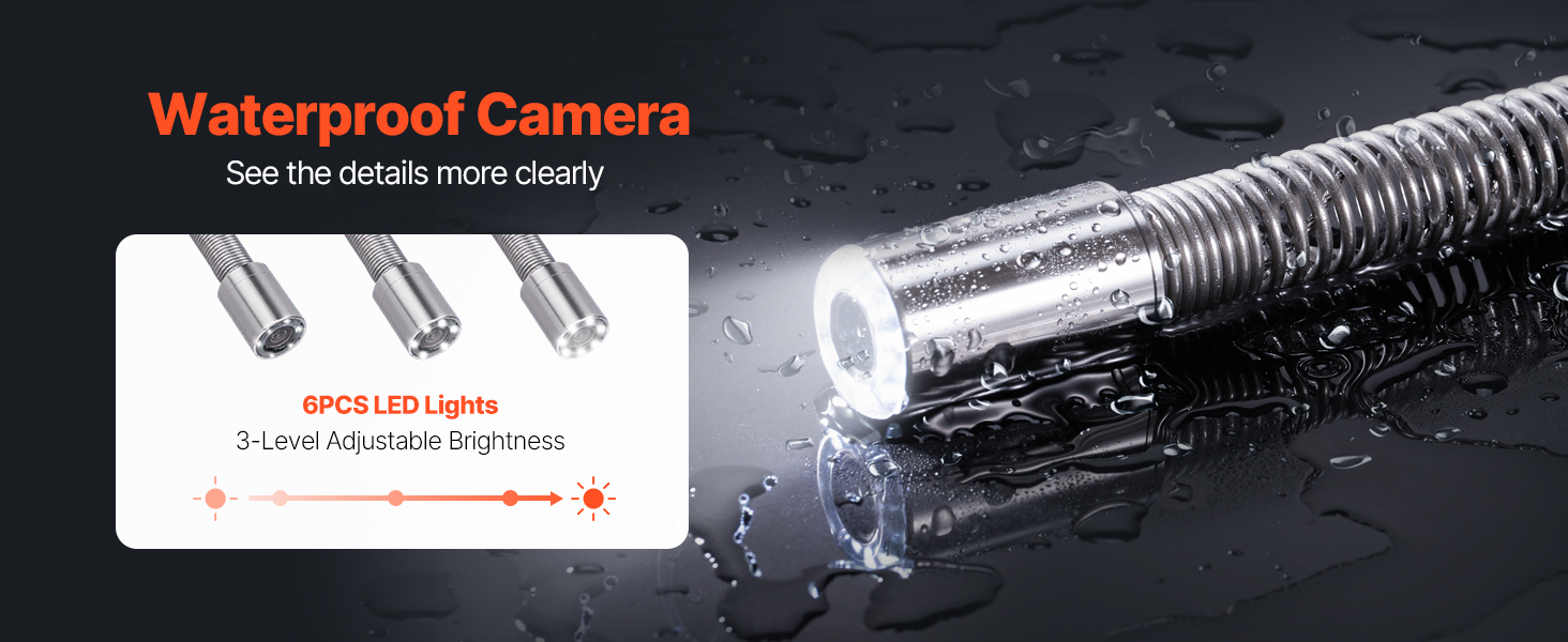 Táto vodotesná kamera vybavená 6PCS LED svetlami a 3-stupňovým nastaviteľným jasom zaručuje jasnú viditeľnosť v akomkoľvek prostredí. Vďaka 120° širokouhlému objektívu môžete zachytiť viac detailov v jednom zábere, vďaka čomu sú kontroly a diagnostika rýchlejšie a efektívnejšie.