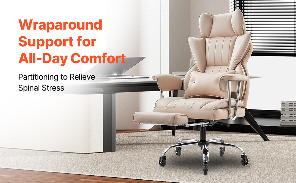 Odolná 400 lbs / 181,44 kg vystužená kovová základňa v kombinácii s kolieskami odolnými proti opotrebovaniu a tichými kolieskami zabezpečuje plynulý 360° pohyb. Táto pevná konštrukcia udržiava stabilitu vašej manažérskej kancelárskej stoličky, takže sa môžete sústrediť na prácu bez obáv z kolísania.