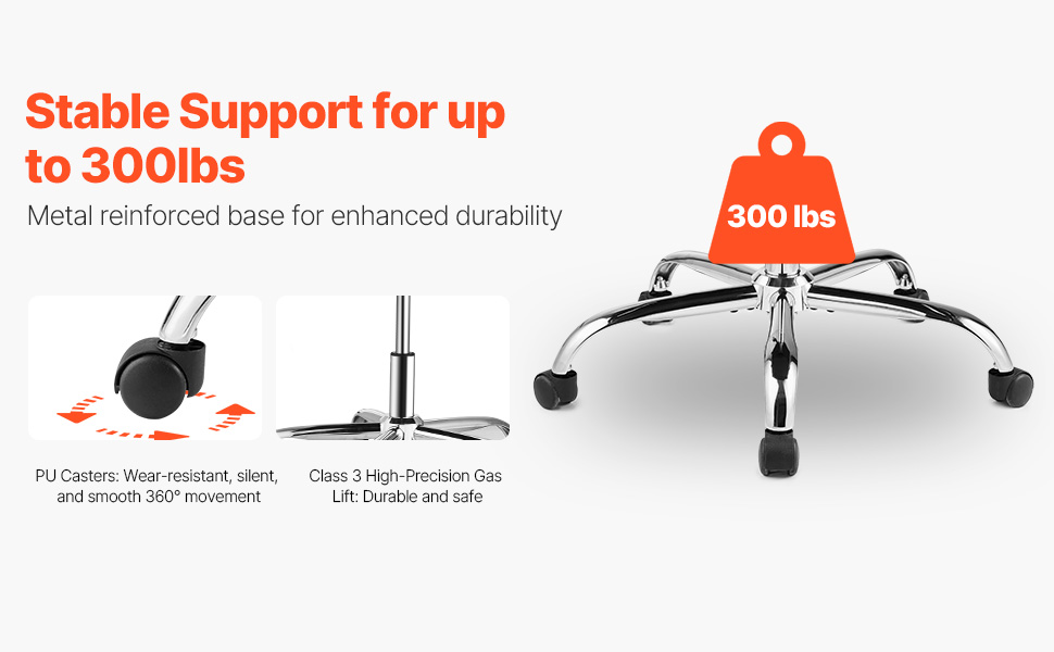 Odolná 300 lbs / 136,08 kg vystužená kovová základňa v kombinácii s kolieskami odolnými proti opotrebovaniu a tichými kolieskami zabezpečuje plynulý 360° pohyb. Táto pevná konštrukcia udržiava stabilitu vašej manažérskej kancelárskej stoličky, takže sa môžete sústrediť na prácu bez obáv z kolísania.