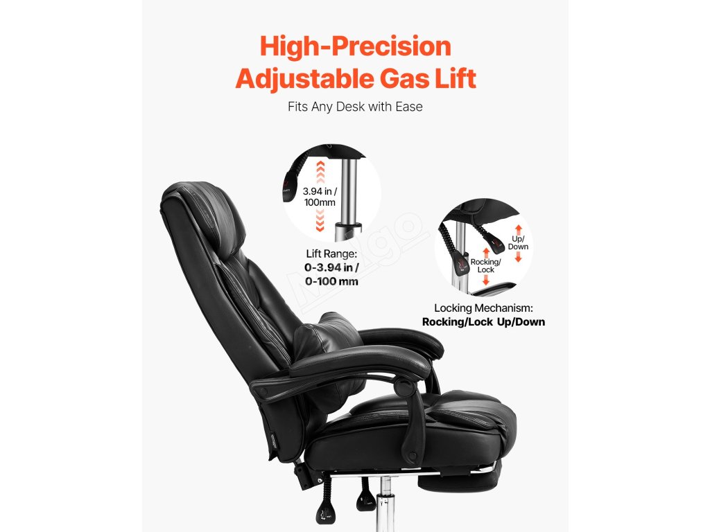 Vďaka rozsahu nastavenia výšky 0 - 3,94 palca sa táto manažérska stolička ľahko prispôsobí výške vášho pracovného stola jediným stlačením tlačidla. Blokovací mechanizmus na hojdacej základni zabezpečuje stabilitu stoličky a spĺňa všetky vaše rôzne kancelárske potreby.