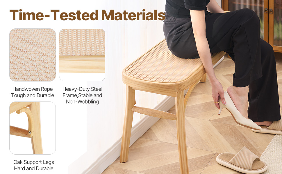 Táto predsieňová ratanová lavica má ručne tkané lanové sedadlo s robustným rámom vyrobeným z masívneho dreva. Jej nosné nohy sú vyrobené z lešteného dubového dreva, čo zaručuje dlhodobú odolnosť a stabilitu bez kolísania v priebehu času.