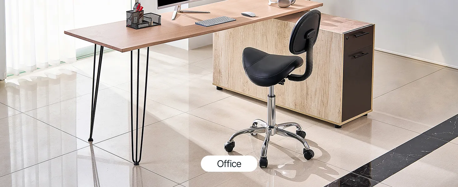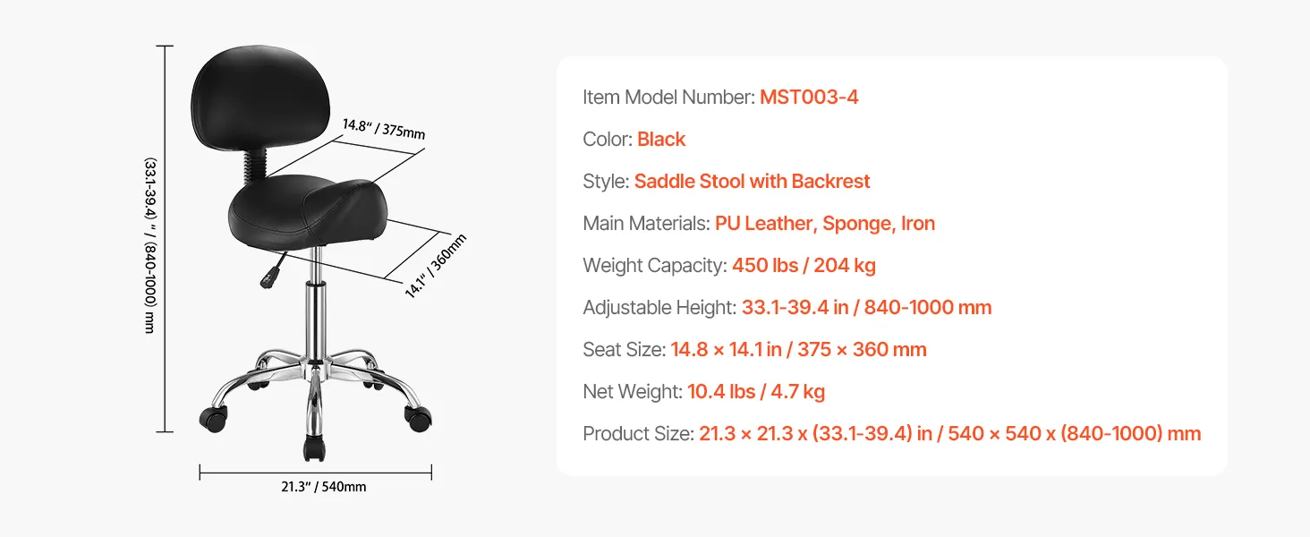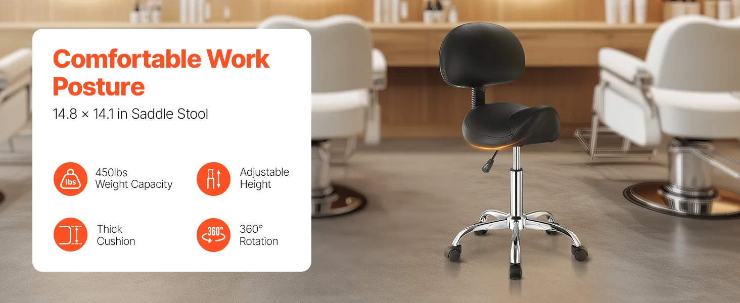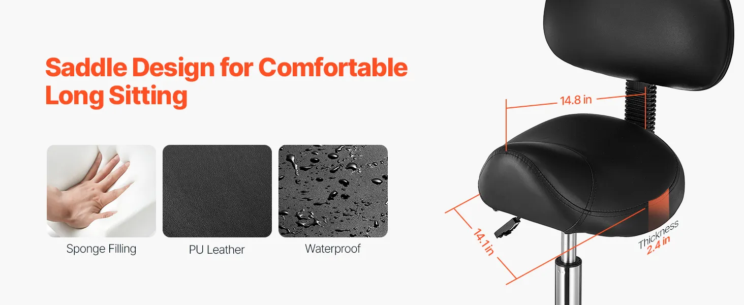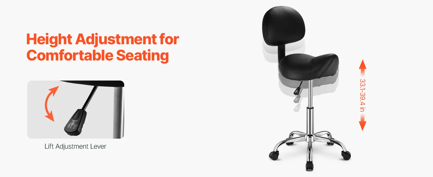 Táto sedlová stolička pomáha zmierniť napätie v chrbte a bedrách a je vybavená nadrozmerným, zhrubnutým vankúšom, ktorý unesie až 450 libier. Nastaviteľná výška sedadla a 360° otočný pohyb zabezpečujú pohodlie a efektivitu počas práce.