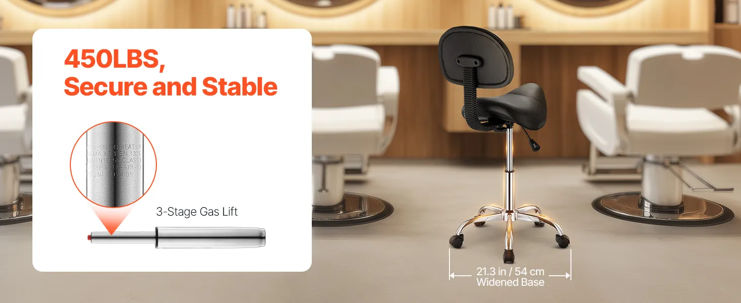 Táto sedlová stolička má ergonomický dizajn so zosilneným vankúšom pre väčšie pohodlie. Vďaka hydraulickému zdvihu s certifikátom SGS unesie až 450 kg a ponúka nastaviteľnú výšku a otáčanie o 360°, takže je ideálna pre kliniky, salóny a laboratóriá.