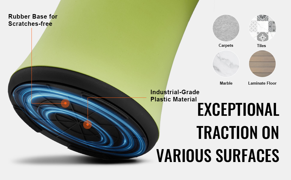 Veľká, robustná základňa má protišmykovú textúru, ktorá zabraňuje pošmyknutiu, zatiaľ čo gumový poťah chráni podlahy pred poškriabaním.