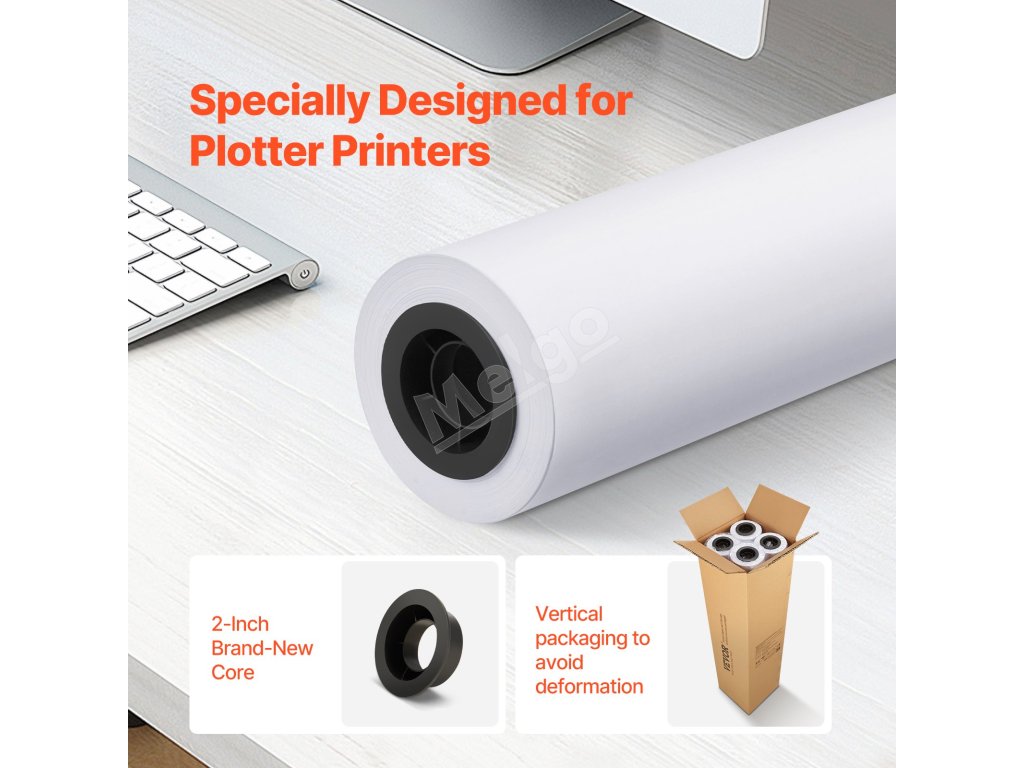 Toto balenie veľkoformátového papiera obsahuje štyri kotúče, každý so šírkou 36 palcov a dĺžkou 150 stôp, s presným meraním 80 g/m² pre konzistentné a vysokokvalitné výsledky. Dvojpalcové jadro je vhodné pre väčšinu štandardných plotrových tlačiarní.