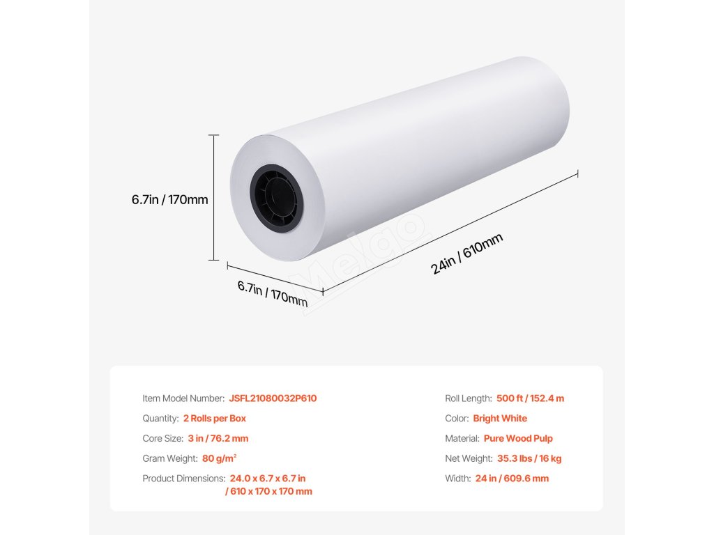 Toto balenie veľkoformátového papiera obsahuje dve rolky, každú širokú 24 palcov a dlhú 500 stôp, s presným meraním 80 g/m² pre konzistentné a vysokokvalitné výsledky. Trojpalcové jadro je vhodné pre väčšinu štandardných technických tlačiarní.