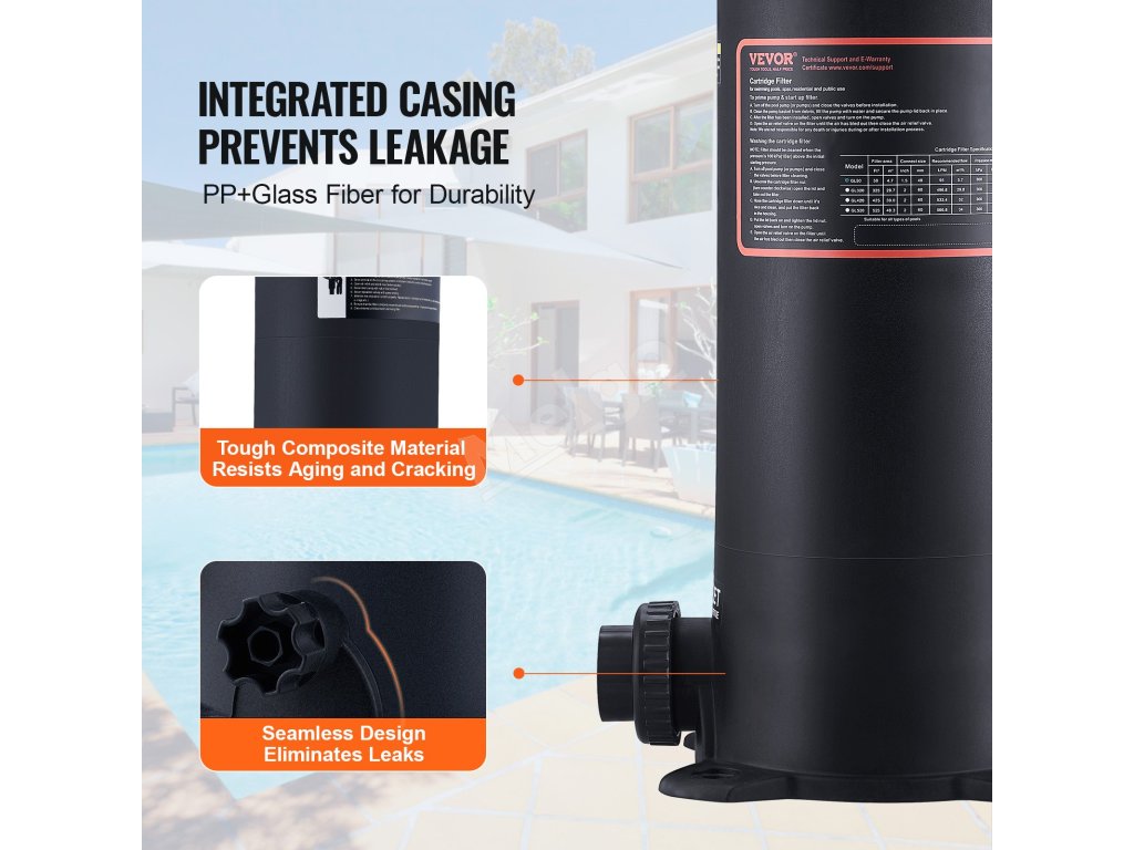 Náš robustný jednodielny kompozitný kryt zabraňuje únikom a chráni vnútorné komponenty pred poveternostnými vplyvmi. Obsahuje tlakomer na jednoduché monitorovanie a automatický poistný ventil namontovaný na hornej strane, ktorý zabraňuje výbuchu, a ponúka bezpečné a účinné riešenie čistenia vášho bazéna.