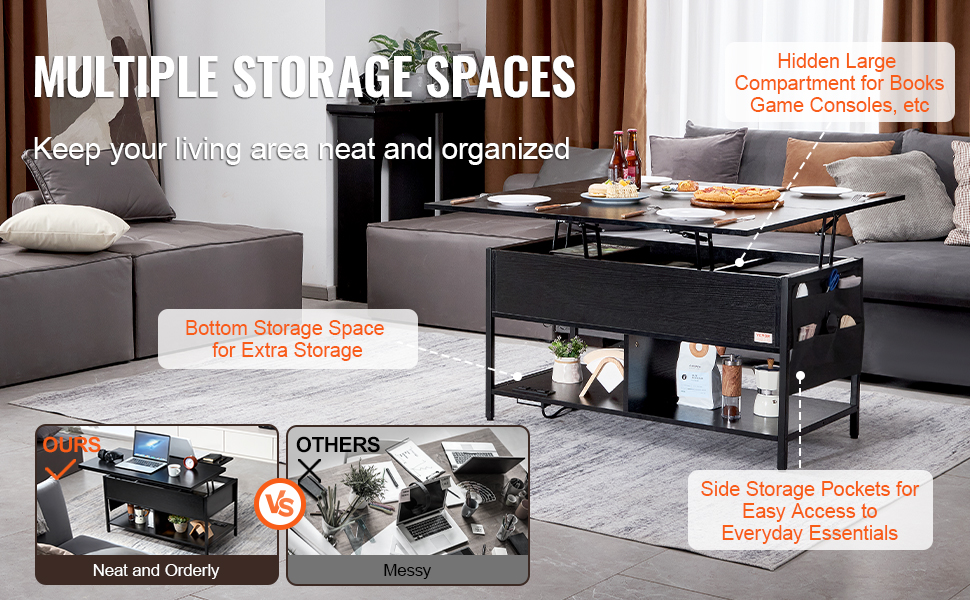 Zdvihací konferenčný stolík obsahuje skrytý úložný priestor ideálny na knihy, herné konzoly a diaľkové ovládače. Bočné police ponúkajú ďalší úložný priestor na každodenné potreby, zatiaľ čo úložné vrecká poskytujú ďalší priestor na pohodlný prístup. Spodný úložný priestor zabezpečuje organizované obytné priestory.
