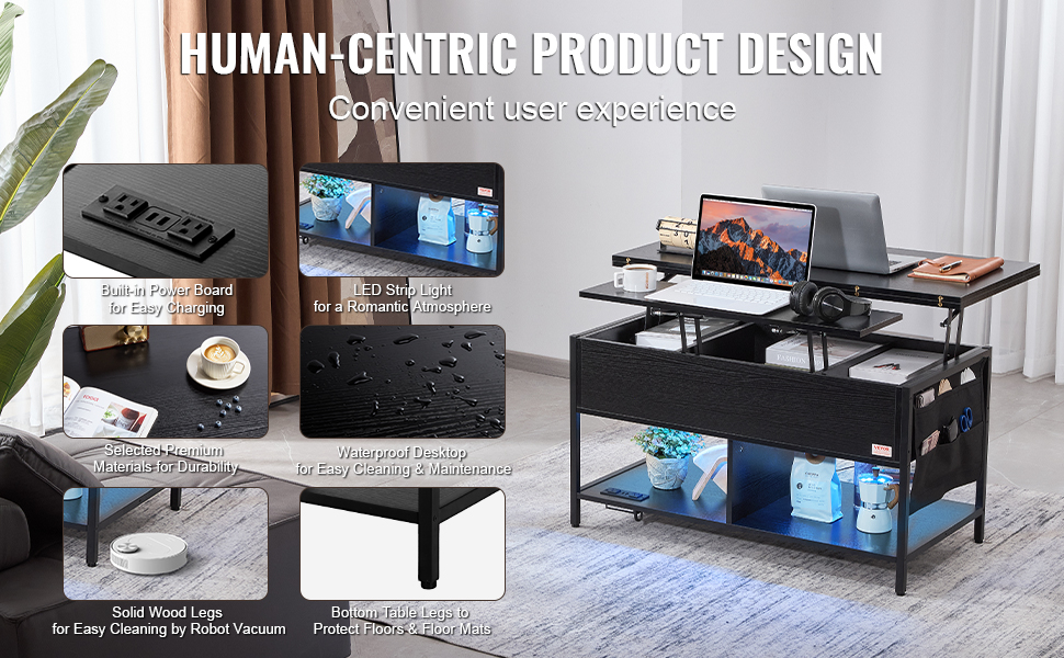 Tento konferenčný stolík sa bez námahy nastaví do ideálnej výšky a slúži nielen ako konferenčný stolík, ale aj ako pohodlný dočasný jedálenský stôl alebo s plávajúcou vyvýšenou pracovnou plochou na prácu a odkladanie vecí v obývačke.