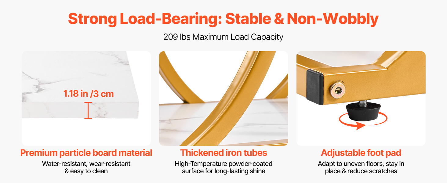 Vďaka hladkej doske z drevotrieskových dosiek je náš drevený stredový stôl odolný voči opotrebovaniu a vode. Jeho rúrky odolávajú tlaku a deformácii. V kombinácii s povrchovou úpravou vypaľovanou pri vysokých teplotách je odolný voči korózii a hrdzi. Jeho súčasťou je aj nastaviteľná podložka pod nohy na zvýšenie stability.