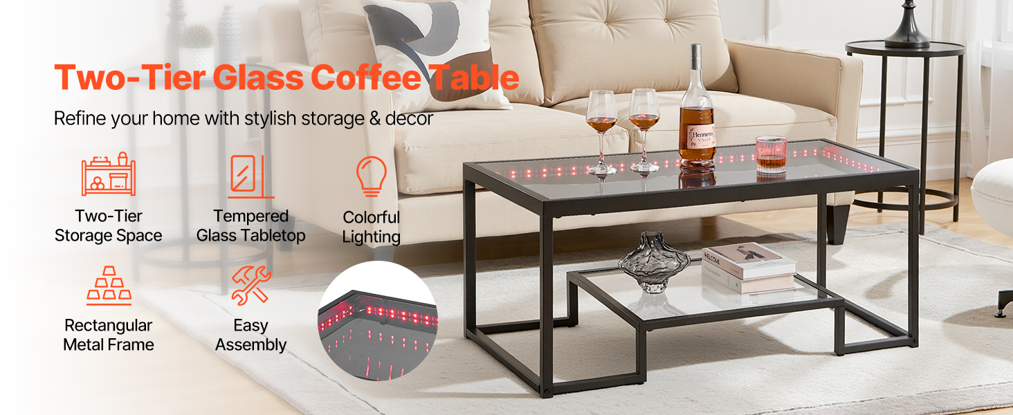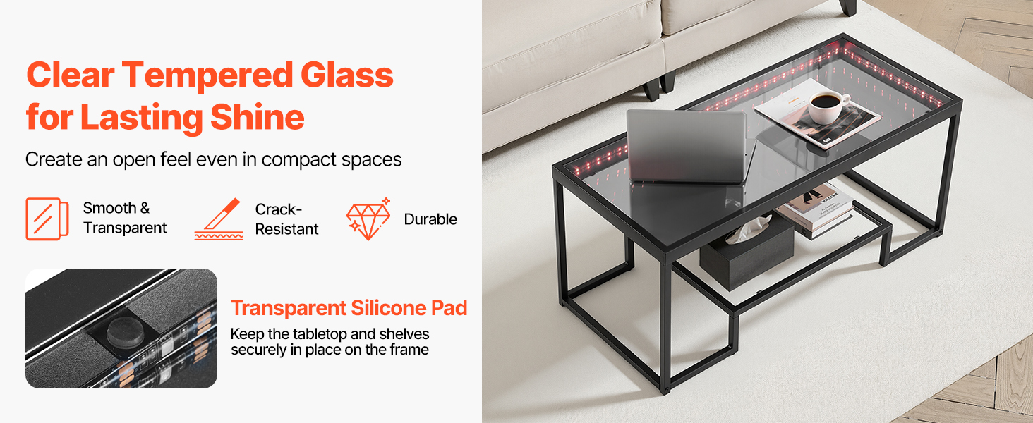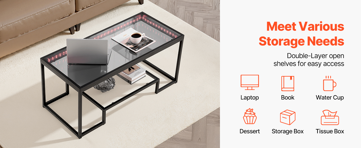 Náš konferenčný stolík z tvrdeného skla, ktorý poskytuje úložný priestor na 2 pneumatiky, umožňuje jednoduchú organizáciu každodenných predmetov, ako sú notebooky, knihy, šálky, občerstvenie, nabíjačky a krabičky na vreckovky. Udrží váš obytný priestor uprataný a funkčný a zároveň dodá vašej domácnosti praktické úložné riešenia.