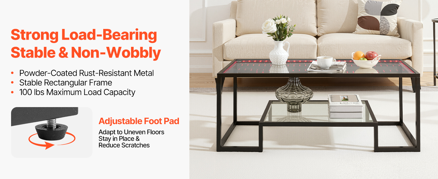 Náš sklenený stredový stolík je vybavený vysokopevnostnými rúrkami, ktoré odolávajú tlaku a deformácii. V kombinácii s povrchovou úpravou vypaľovanou pri vysokých teplotách je odolný voči korózii a hrdzi. Jeho nastaviteľná podložka pod nohy sa prispôsobí nerovnej podlahe, zvyšuje stabilitu, znižuje posúvanie a chráni podlahu pred poškriabaním.