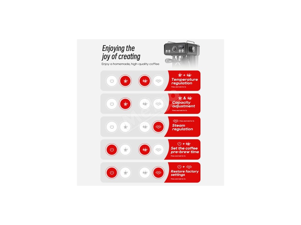 Tento poloautomatický kávovar dokáže nastaviť množstvo kávy, teplotu extrakcie, teplotu pary a čas predsparenia. Bohaté programovacie funkcie vám pomôžu nastaviť kyslosť a horkosť kávy, ktorá vám vyhovuje. Dokonca aj pri kávových zrnách rôznych chutí vám tento programovateľný kávovar pomôže extrahovať ich chuť.