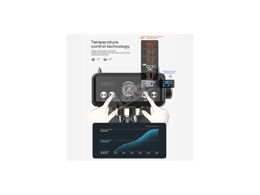 Kávovar na espresso HiBREW H10A využíva výkonné vysokotlakové čerpadlo s tlakom 20 barov a technológiu rovnomerne vlhkej predsparenej infúzie, ktorá zabezpečuje úplnú extrakciu kávovej peny. Má silné a odolné telo z brúsenej nehrdzavejúcej ocele, stabilnú štruktúru, odolnosť voči nečistotám a ľahko sa čistí.