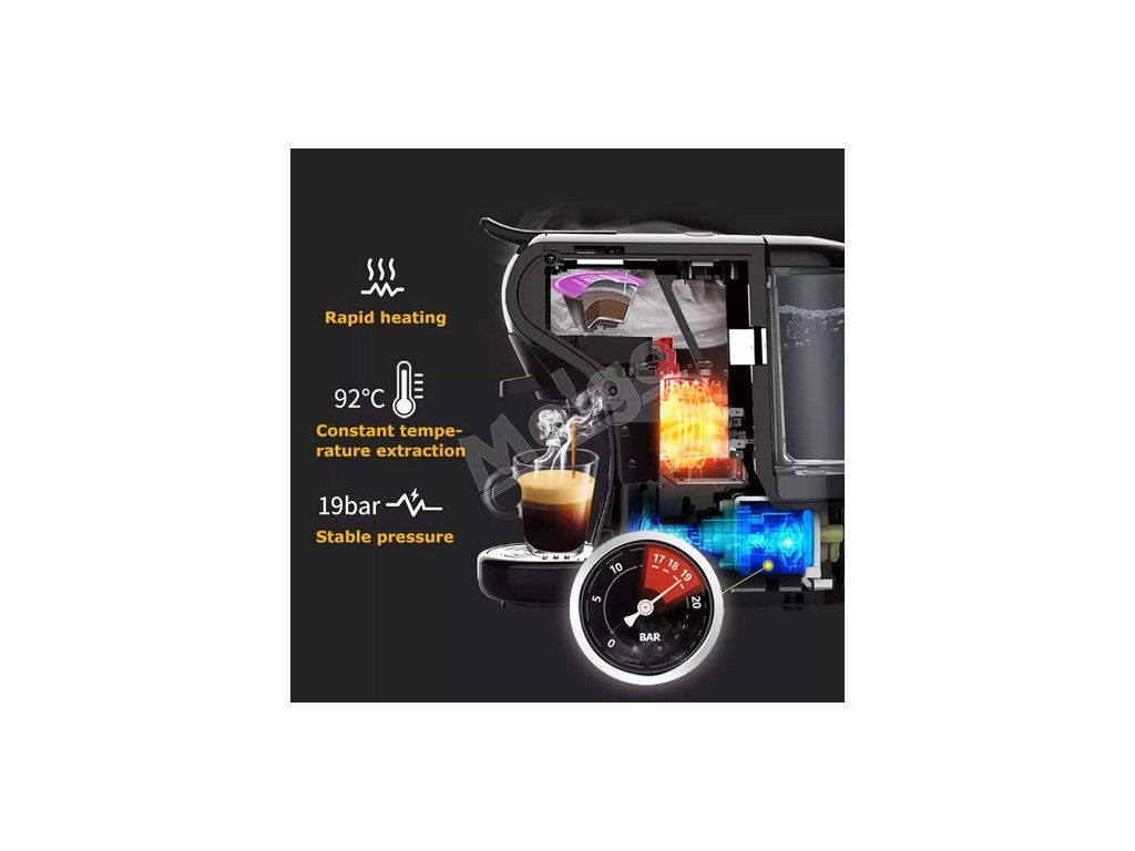 S výkonom 1450 W a 19 bastabilným tlakom čerpadla dokáže tento kávovar zabezpečiť rýchly ohrev a extrakciu pri konštantnej teplote 92 stupňov Celzia.