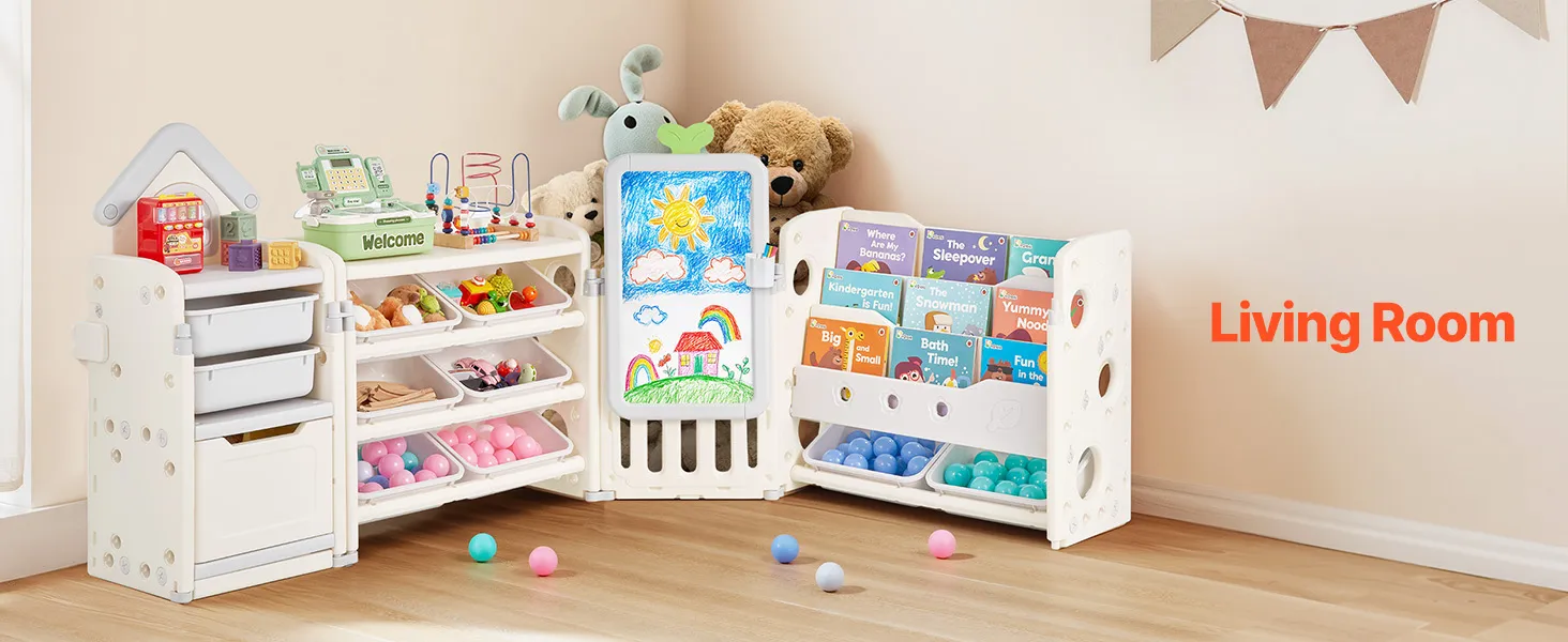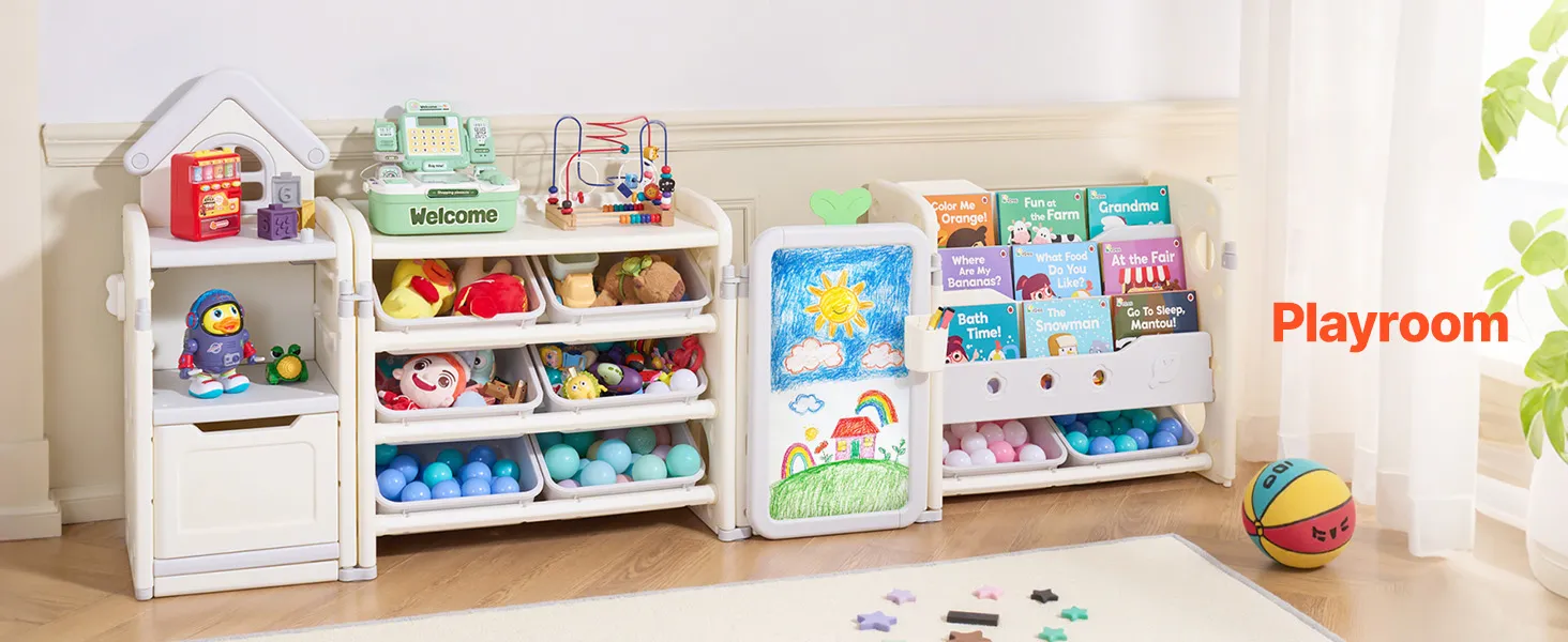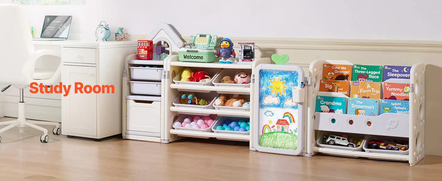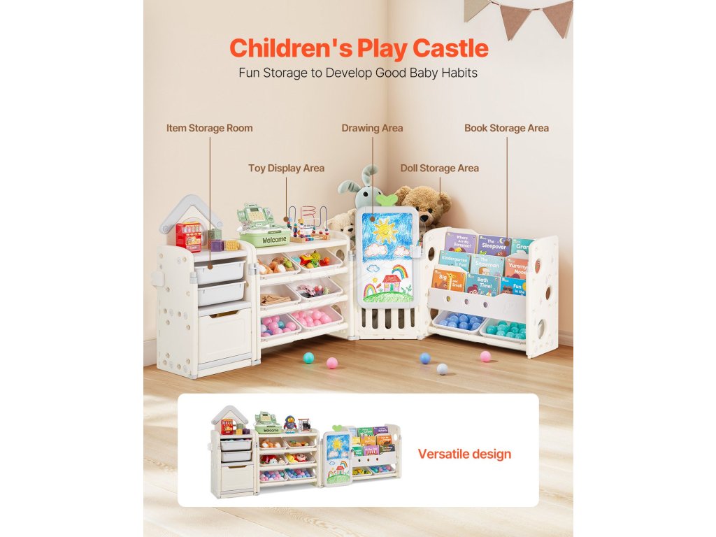 Tento organizér obsahuje priestor na vystavenie hračiek, časť na ukladanie kníh, úložný priestor, priestor na kreslenie a priestor na ukladanie bábik, ktorý poskytuje dostatok miesta na hračky, knihy, písacie potreby, bloky a ďalšie.
