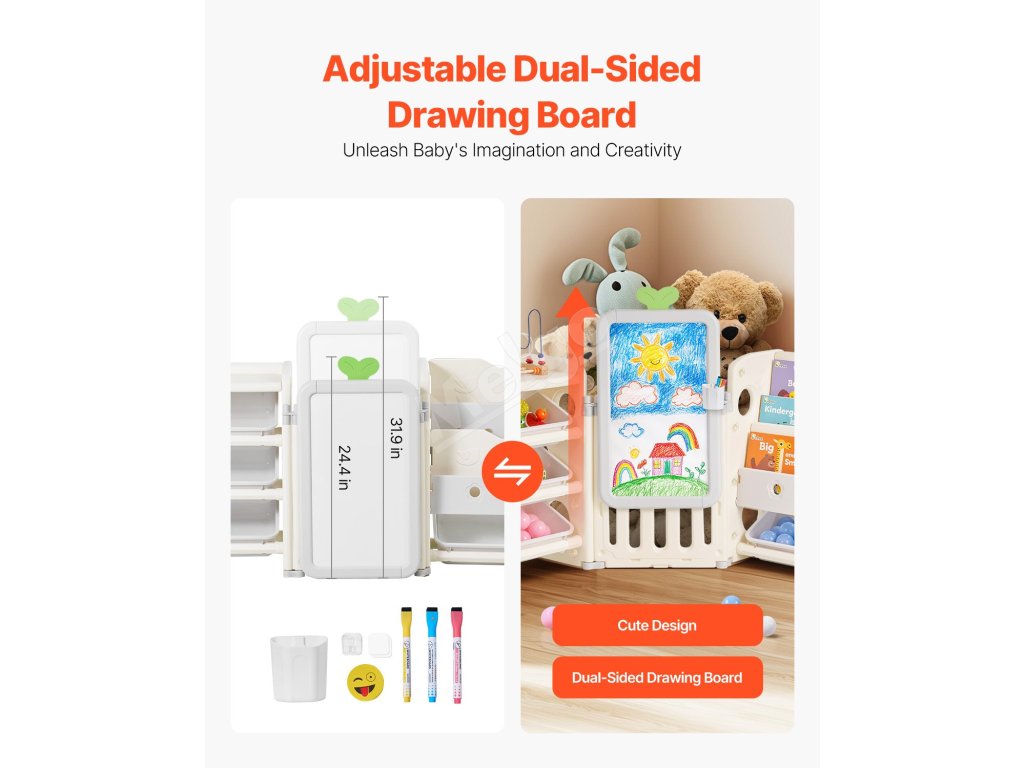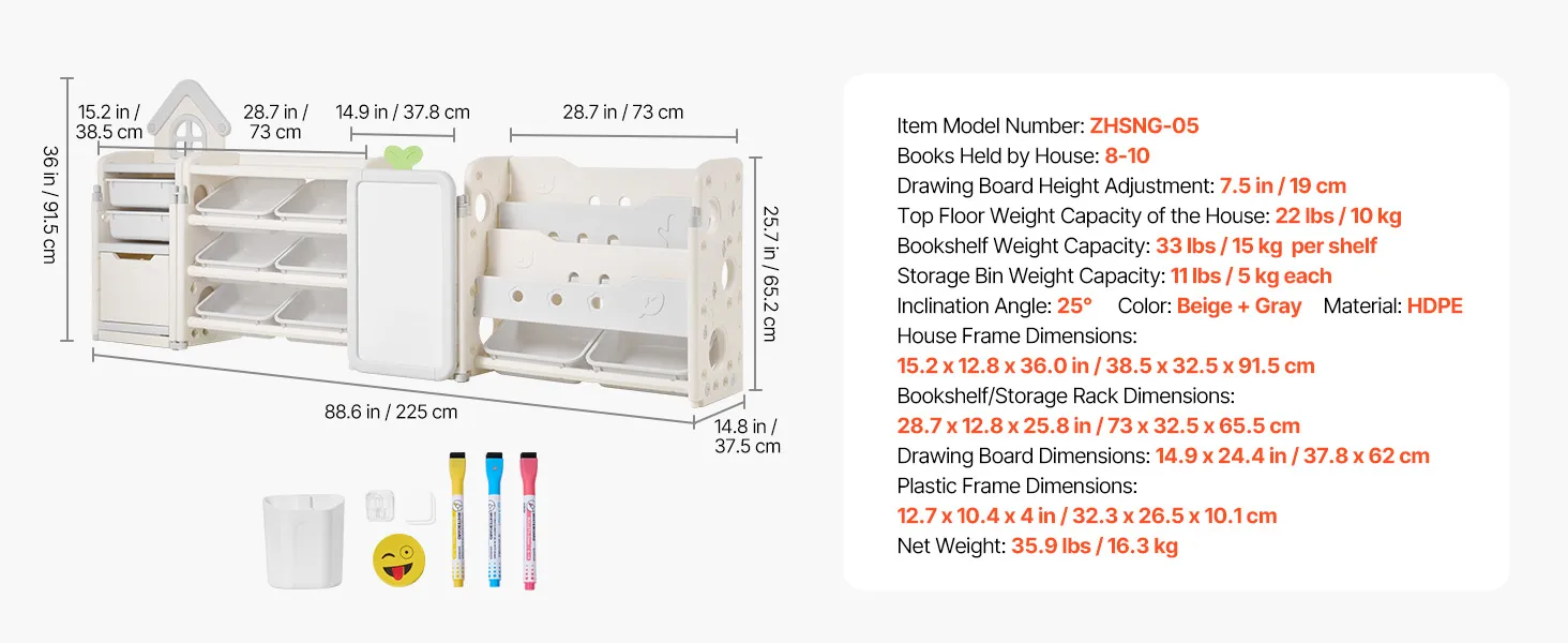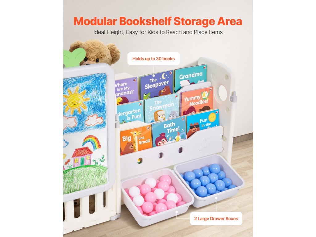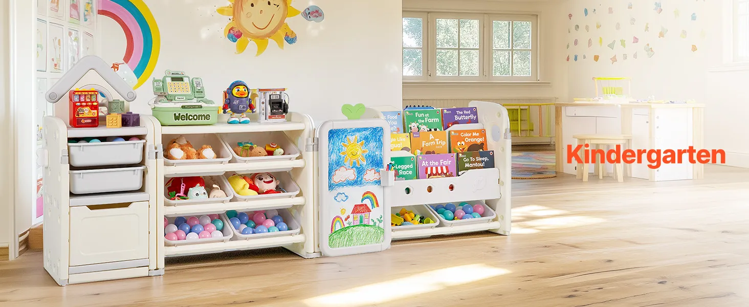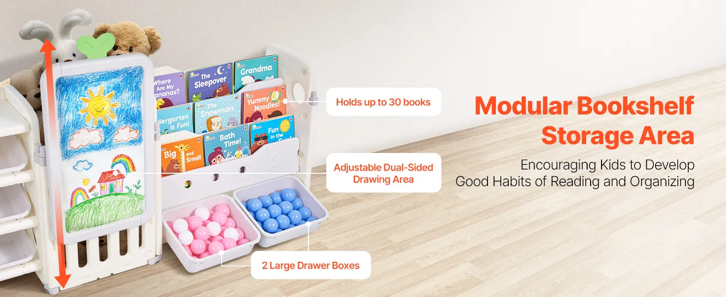 Tento organizér obsahuje priestor na vystavenie hračiek, časť na ukladanie kníh, úložný priestor, priestor na kreslenie a priestor na ukladanie bábik, ktorý poskytuje dostatok miesta na hračky, knihy, písacie potreby, bloky a ďalšie.