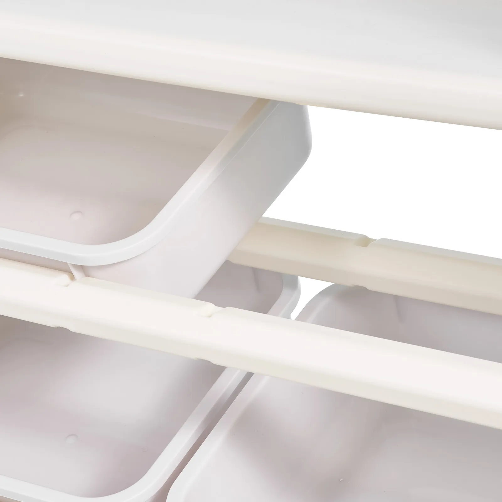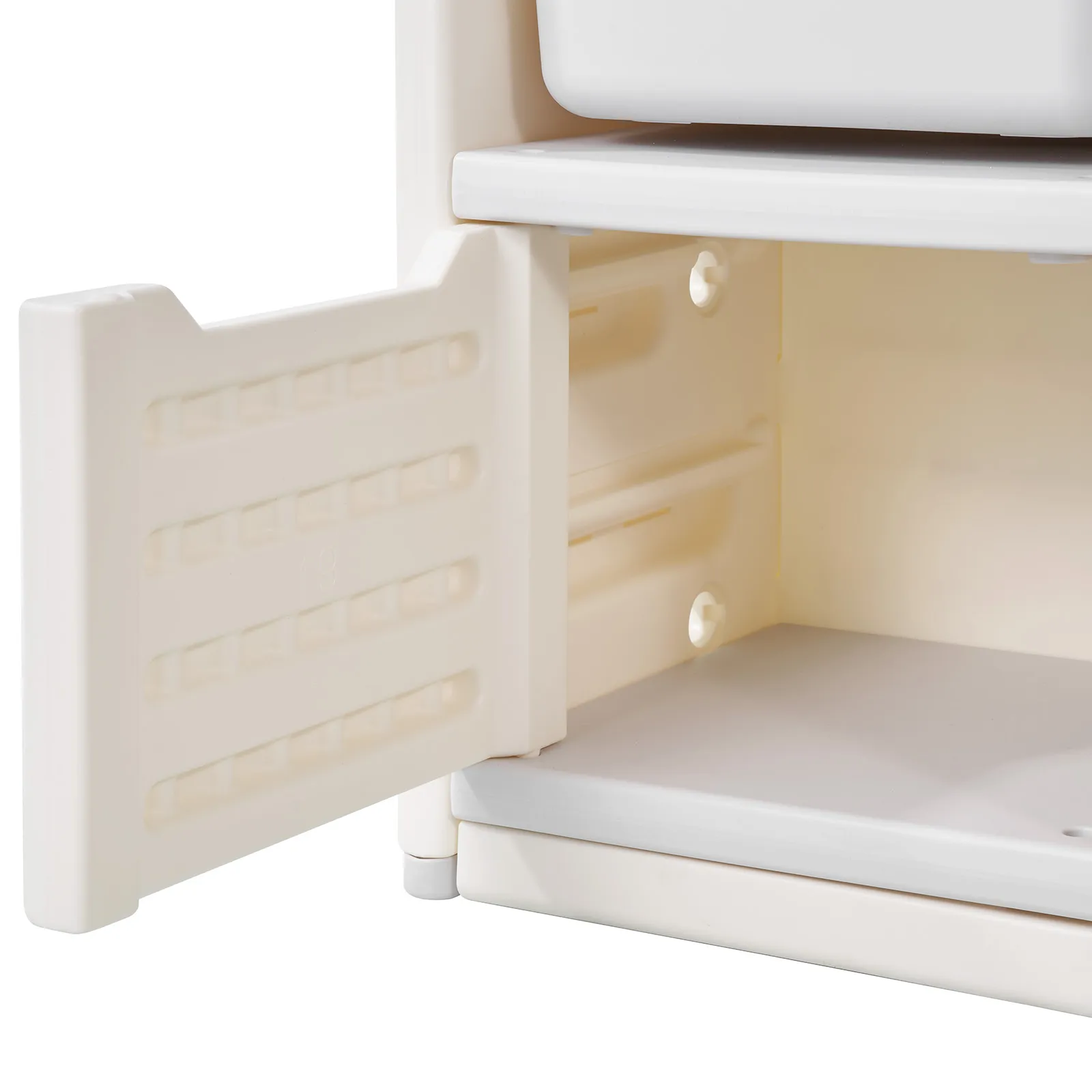 Otvorené úložné koše spočívajú v šikmých, protišmykových drážkach, vďaka čomu deti ľahko uvidia svoje obľúbené hračky a zároveň je zaistené, že koše zostanú bezpečne na svojom mieste.