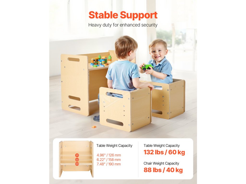 Naša súprava stola a stoličky Montessori na odstavenie dieťaťa poskytuje výnimočnú nosnosť, pričom stôl unesie až 132 libier / 60 kg a stolička až 88 libier / 40 kg, čo zaručuje stabilitu a bezpečnosť detí počas používania.