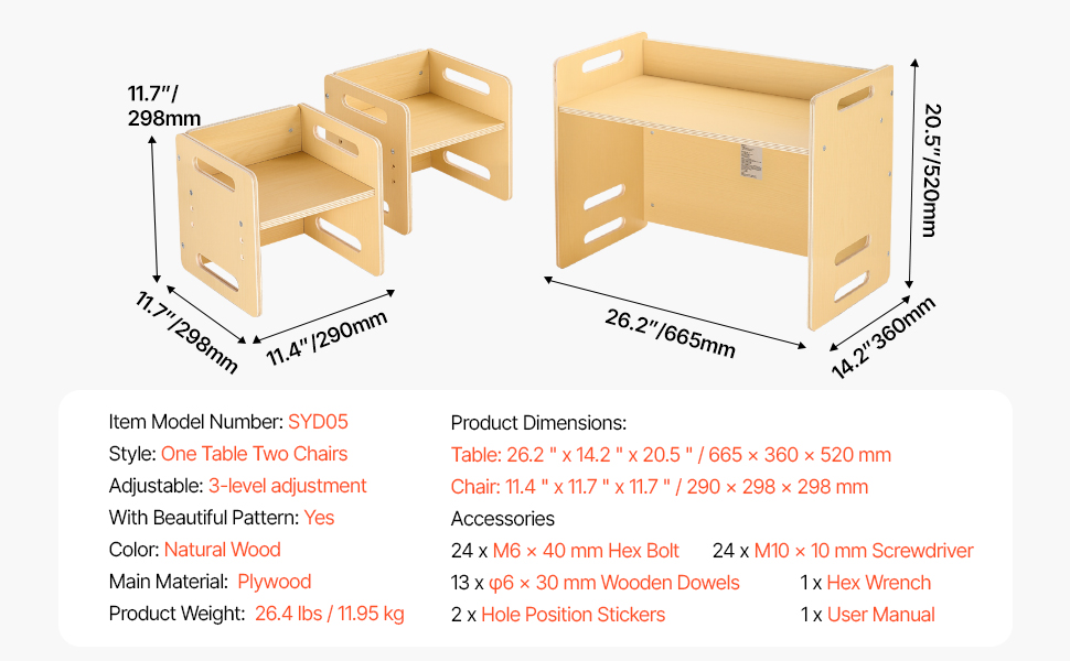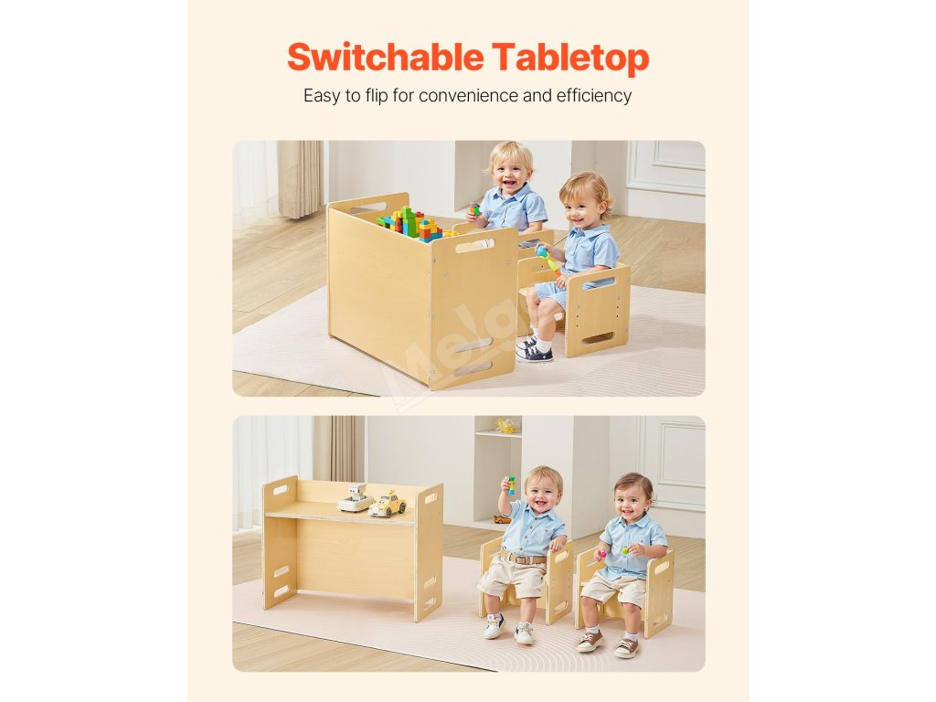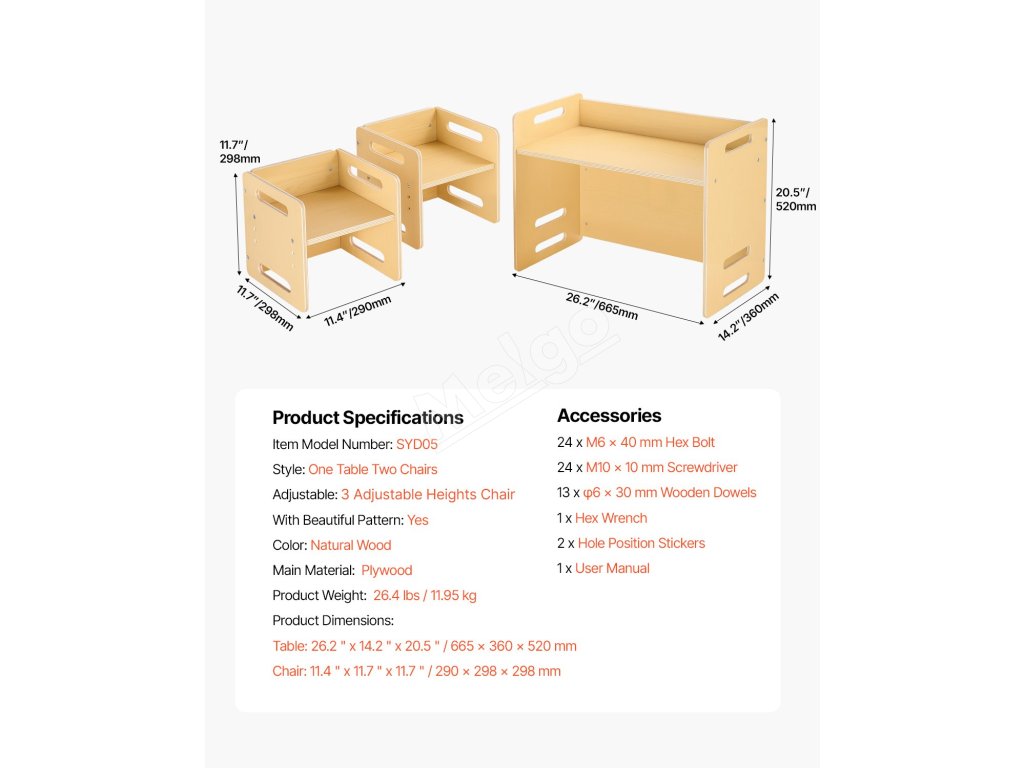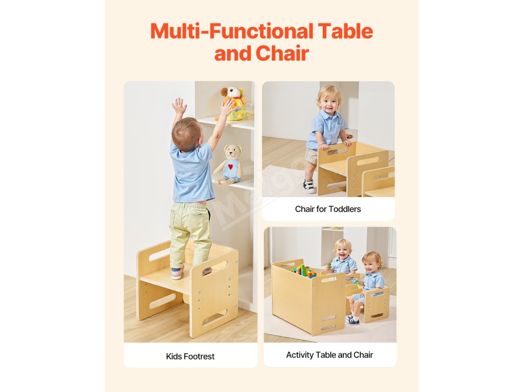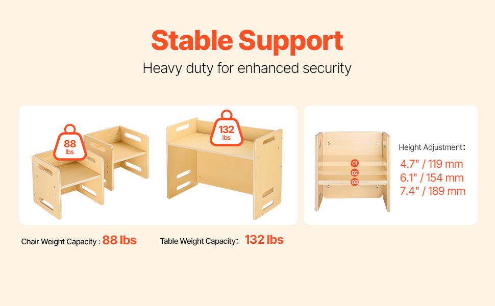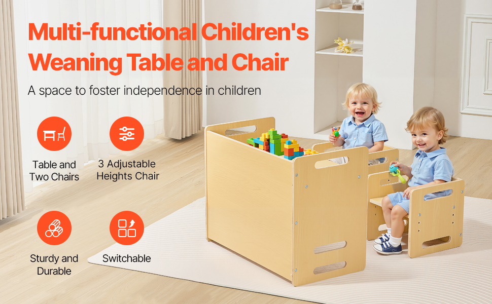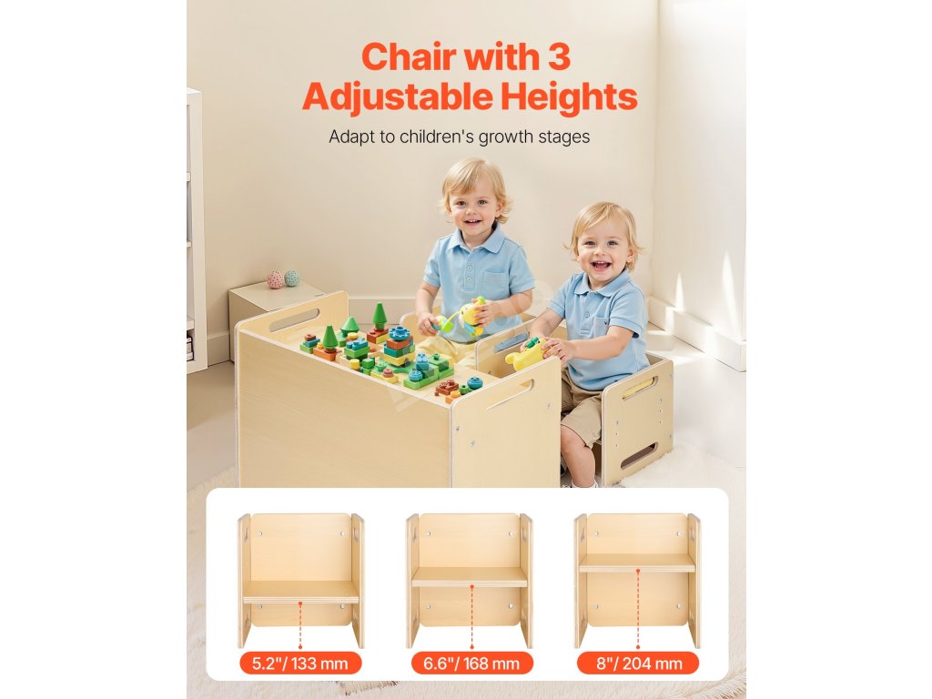 Táto súprava stola a stoličky na odstavenie dieťaťa s hravým dizajnom umožňuje tri nastavenia výšky (4,7 palca / 119 mm, 6,1 palca / 154 mm, 7,4 palca / 189 mm). Je vyrobená z robustnej preglejky s hladkými hranami, je bezpečná a vhodná na rôzne činnosti.