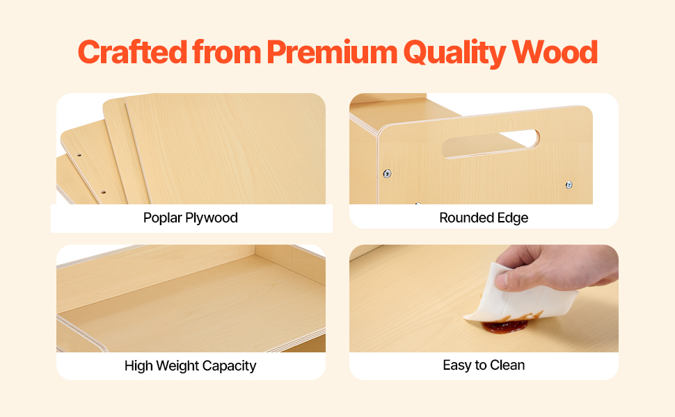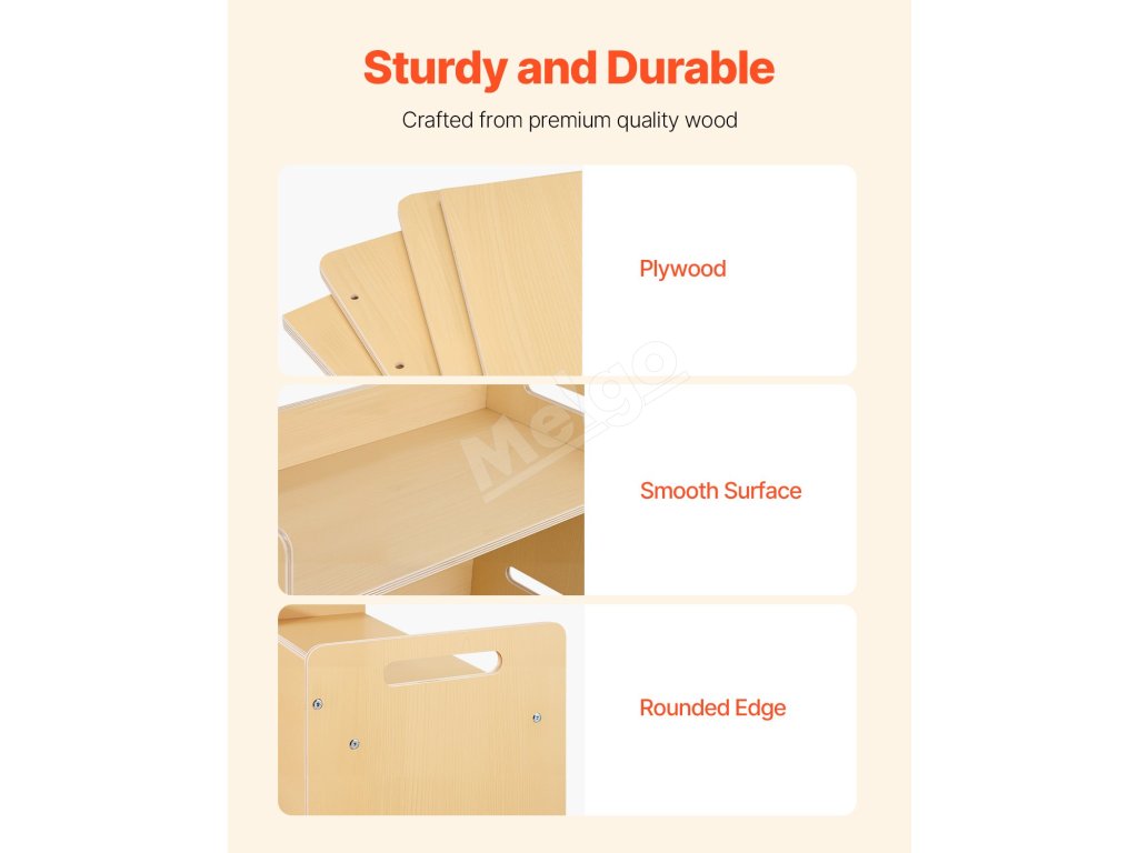 Tento Montessori nábytok je vyrobený z odolnej preglejky a má zaoblené rohy, ktoré znižujú riziko zranenia. Jeho silná nosnosť a ľahko umývateľný povrch zabezpečujú pohodlie, bezpečnosť a stabilitu pre vaše dieťa.