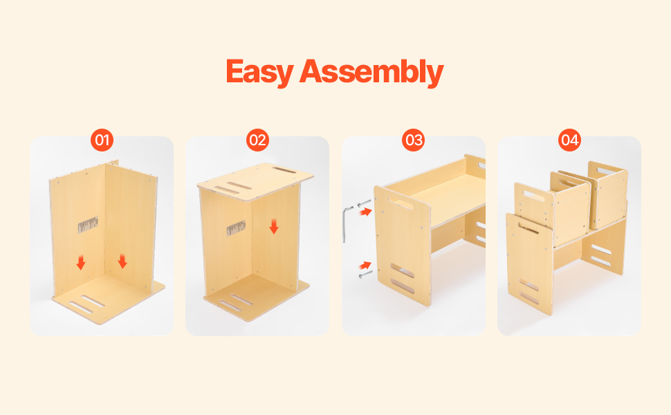 Naša súprava stola a stoličky Montessori na odstavenie dieťaťa zjednodušuje proces montáže tým, že odstraňuje zložité kroky. Stačí postupovať podľa jednoduchých pokynov a budete ju mať zostavenú rýchlo a bez problémov.
