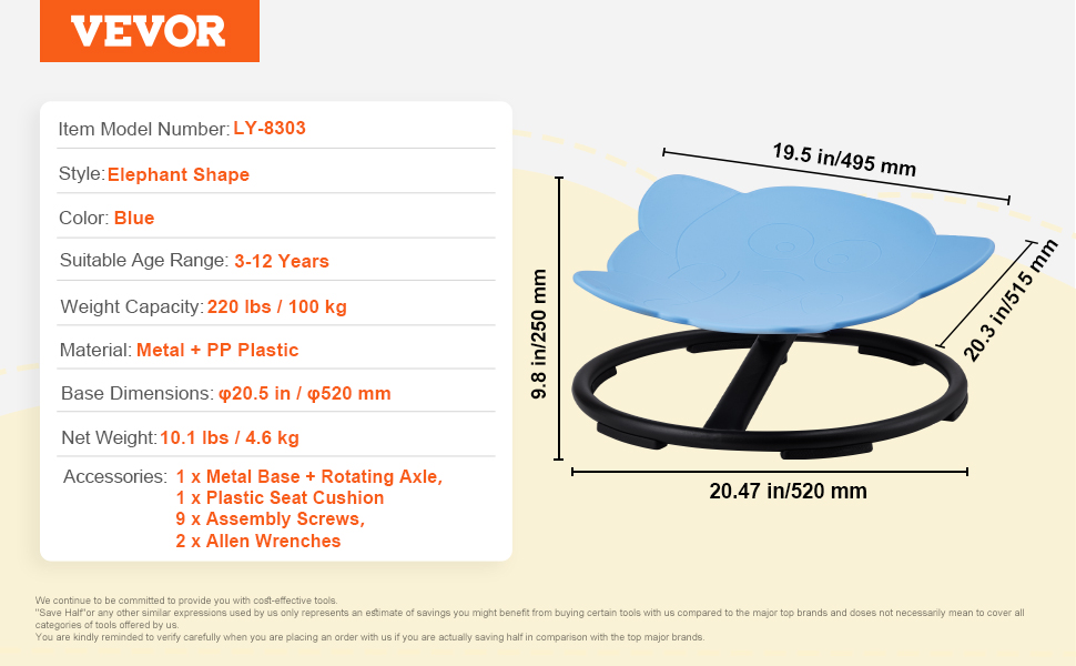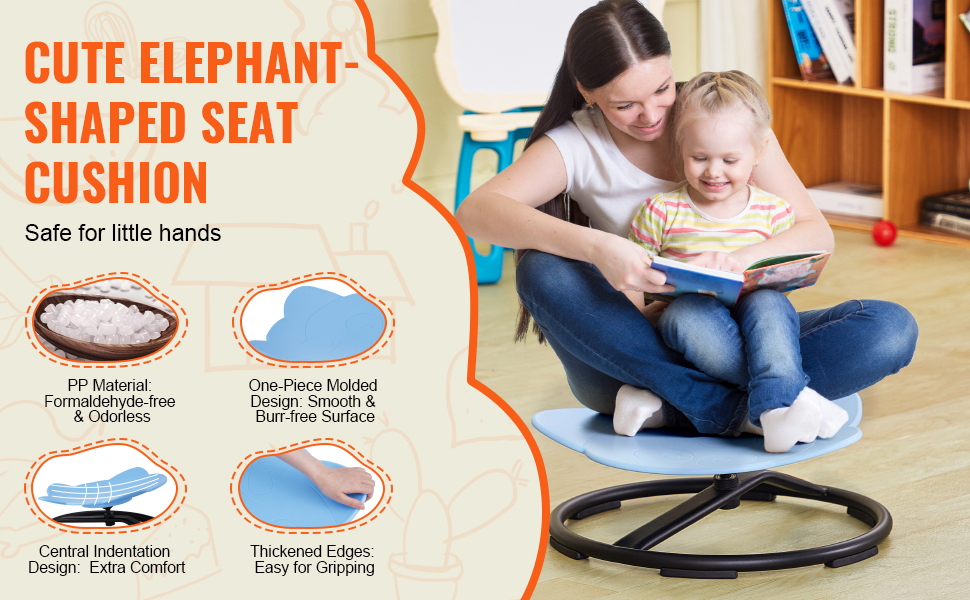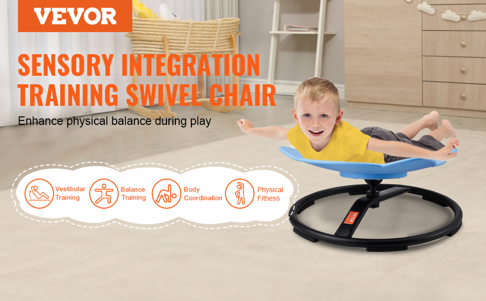 Táto 360° otočná stolička zapája vestibulárny systém detí, zlepšuje koordináciu a rovnováhu. Je vybavená robustnou 20,5-palcovou kovovou základňou, unesie až 220 kg a má polstrované sedadlo pre väčšie pohodlie. Protišmykový dizajn a hladké hrany zaisťujú bezpečnosť. Ľahko sa montuje, je ideálna na domáce použitie.