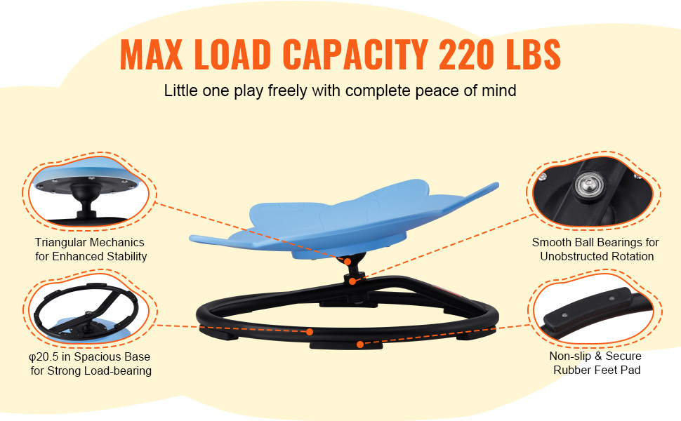 Detská rotujúca stolička s rozšírenou 20,5-palcovou kovovou základňou unesie až 220 kg. Jej trojuholníková konštrukcia s guličkovými ložiskami zabezpečuje plynulé otáčanie a protišmykový dizajn zabraňuje posúvaniu počas hry.